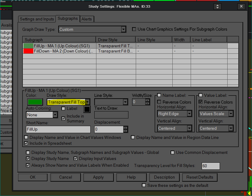 G, Simply add the Study Flexible MA from the Add Custom Study button then select it in the User Contributed Studies I've attached 2 images that show it in the Study Settings Window. Select your MA's and for each one select the Color Fill you want using Fill Top Down and Fill Bottom Up. You should get results similar to mine. If not let me know. -- Scott |