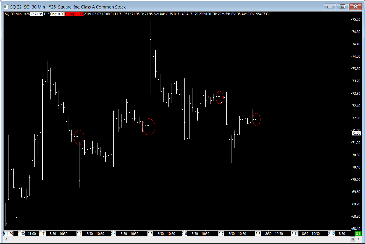 I have attached a SQ 30 bar chart. The session times for me are 6:30 to 13:00 pst, regular mkt hours. Why am I getting a small bar(tick) for the 13:00 hr where I have circled in red? This is a bad bar, as it usually is very small with just a few trades in it and its after I don't want a new bar started? How do I make my chart end at 13:00 or on the closing bell without getting this bar?