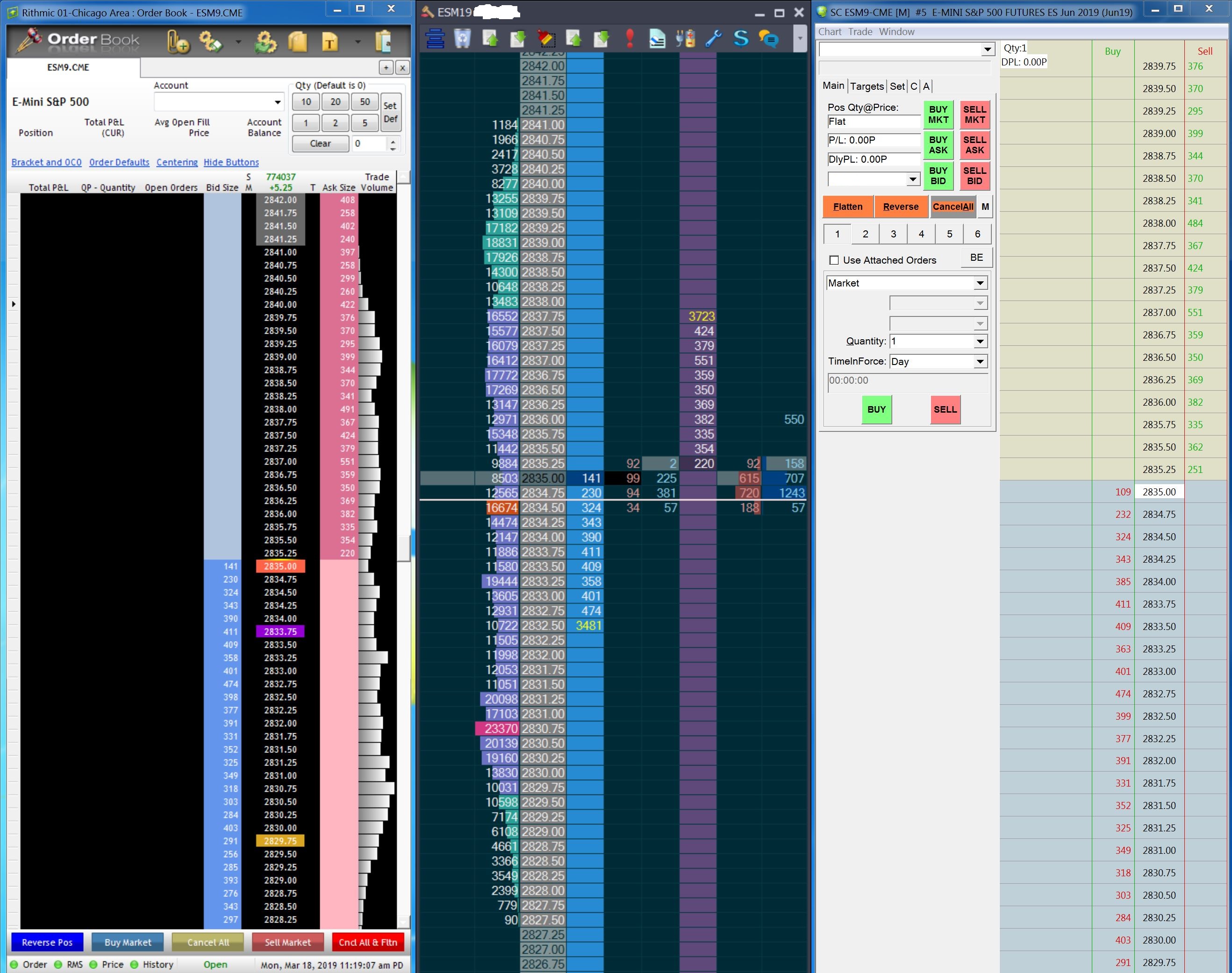 The market depth values displayed in the SierraChart DOM don't match the data coming from either Rithmic or Gain. I've checked sim and live connections for both Rithmic and Gain, and none of the four combinations produces correct data in the SC DOM. Usually, either the inside bid or ask, or both, are incorrect in the SC DOM. Usually, price levels farther away from the inside bid/ask ARE correct but sometimes not. Initially I thought that it was a latency issue (i.e. SC is slower) or something to do with a refresh rate in the SC DOM so I recorded my screen and re-watched it at half-speed... the values that SC displays are never displayed in the native data feed. So, it's not just a latency issue; the values are actually incorrect. In the first screenshot attached, I show Rithmic's R-Trader (left) for ESM19, vs Jigsaw (center), and Sierrachart (right). You can see that SC doesn't match either R-Trader or Jigsaw, which match each other. In the second screenshot attached, I show Gain's OEC Trader (right) for UBM19, vs Sierrachart (left). Jigsaw was also running in this case but isn't shown. Once again, OEC and Jigsaw matched each other but SC had different values. I've tested many symbols and the result is always the same. Has anybody else noticed this or know what's causing it? If I had access to other data feeds I would test them too. |