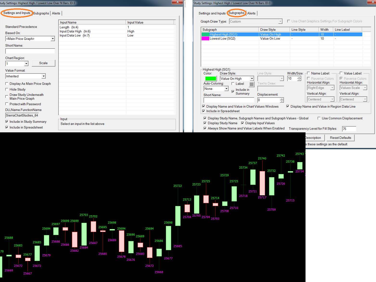 Try: High and Low Highest High/Lowest Low Over N Bars + Study Subgraph Add (if you want offset) https://www.sierrachart.com/index.php?page=doc/StudiesReference.php&ID=272#Study_Subgraph_Add edit: Attachment Date Time Of Last Edit: 2019-03-30 20:52:54