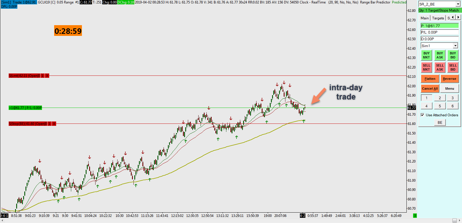 Hello, wondering whether this is possible using SierraChart I have a Crude Oil spread open -10 @ 57.78 CLK19 Now I also want to do intra-day scalping. Normally when I buy 1@MKT CLK19 around 61.77 (see the screenshot from SIM trading) I will not see the position line. Only attached orders SL + PT will be displayed since the average fill price is way below current intra-day fill Question 1: will move to break-even work correctly in this scenario? I have 20 ticks SL and 40 ticks PT and want to move to BE after 20 ticks open profit is reached. Since break-even price is somewhere around 57 dollars I wonder ... Question 2: is it possible with some setting in Sierra to have intra-day fill displayed "independently" from the original spread position as shown on the screenshot attached (SIM trade) ideally? Date Time Of Last Edit: 2019-04-02 05:49:22