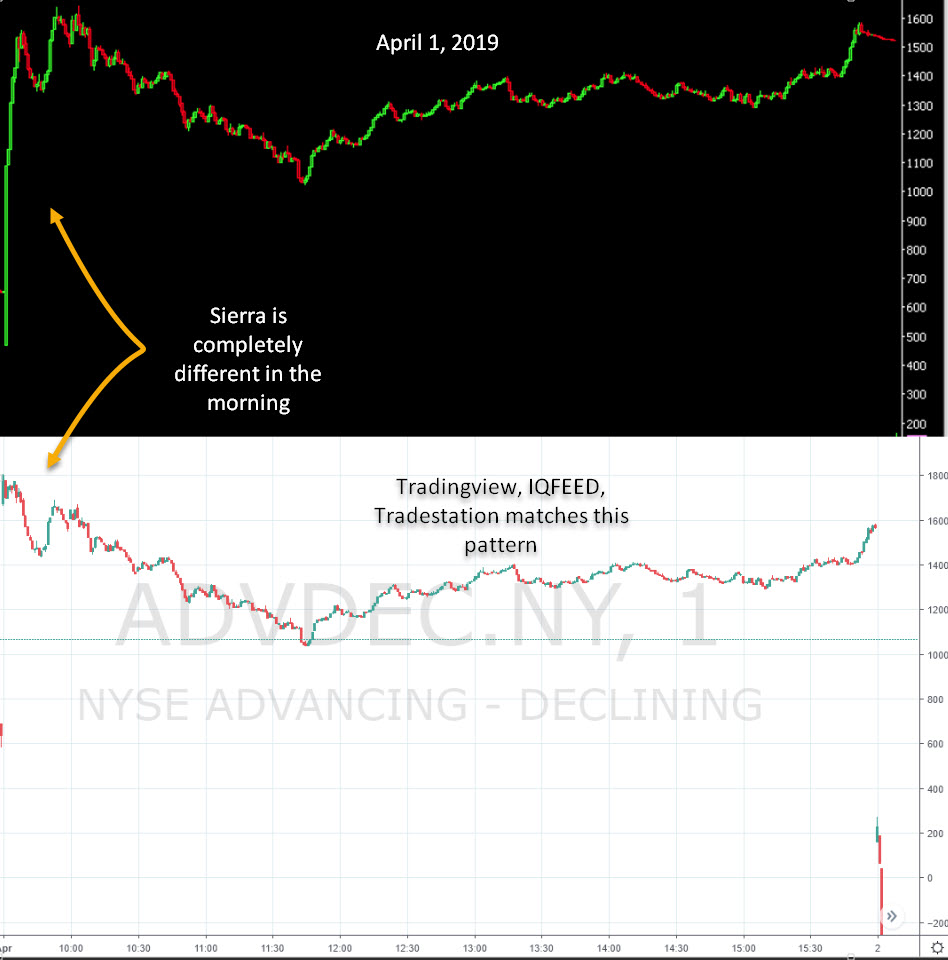 I made a reply in a different post but never got any attention. I'm asking Sierra support to take a look why NISS-NYSE is completely off from every other place I've checked, including the most reliable IQFEED. As you can see the issue is only in the morning but since it's completely off it changes the meaning throughout the entire day since high of day as well as low of day values are wrong. I understand that different providers calculate this differently and that numbers can be off but what's important is the actual graph and if you take a look at the screenshots you will see how different they look. One thing to note is that on April 2nd they mostly matched with other providers but April 1 and 3 did not. I'm using Tradingview as an example but I have confirmed that Tradingview matches with IQFEED. I personally and I'm sure other as well use Adv/Dec to see divergences in various markets and since this isn't showing the proper graph it becomes unusable. |