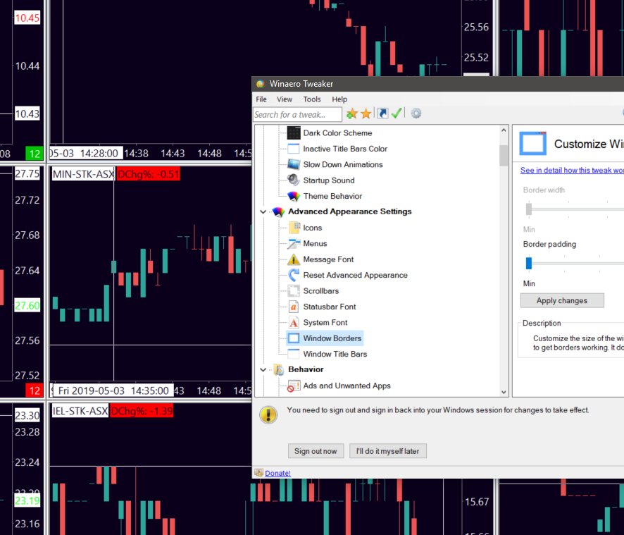 While not dark theme, related: I was able to reduce the border width on charts. The thick system borders applied to apps, plus the default SC border was a waste of space and ugly. Still not able to get the app window borders to change color without installing a new theme. See attached image for how-to and result. Edit: negatives - caused SC menu font to shrink - possibly caused the IBKR TWS login window to behave very oddly. Hard to say if it was related, with TWS being as randomly behaved as it is. Date Time Of Last Edit: 2019-05-03 08:02:28