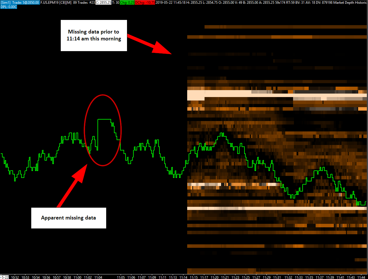 I updated Sierra last night and some of many of my previously set setting reverted to the default. One anomaly I noticed not is the apparent missing data on my charts. See the attached image (S&P500 emini from today) where a number of bars are missing and the "market depth historical graph" is also missing data prior to 11:14 this morning. Let me know if you have any suggestions as to what might be causing this. (My data is coming from Sierra). Thanks |
