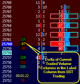 I worked with Frederik from Simple System Trading to develop a work around study that let's you display the delta of the current bid ask columns. The values are displayed in the Label Column with a study called the Display Current Traded Volume. The Display study also allows you to add any SG study to DOM Label Column. The studies can be found here on the Simple System Trading Gumroad: https://gumroad.com/sstfrederik#LRfhaQ See the image attached as an example of what it looks like. In the image I have the High Delta, Current Delta, Low Delta, Total at Ask, Total at Bid, Total Volume, Duration since last Column Refresh, and Total Price Levels. P.S. The boxes highlighting the current traded volume imbalances is a separate study from another source. |