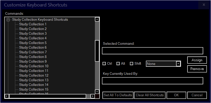I have created a number of study collections as described here Study Collections Under Global Settings>>Customize Keyboard Shortcuts, I see a heading for Study Collection Keyboard Shortcuts listed with shortcuts for Study Collection 1-32 listed. I assumed these would link to my study collections in the order I created them, but that didn't work when I tested the shortcuts. I also tried renaming my study collections to match the shortcut labels (ex. "Study Collection 1") but that didn't work either. I tried to check the documentation for clarification but couldn't find anything. I'd appreciate any guidence you can give me. Thanks |