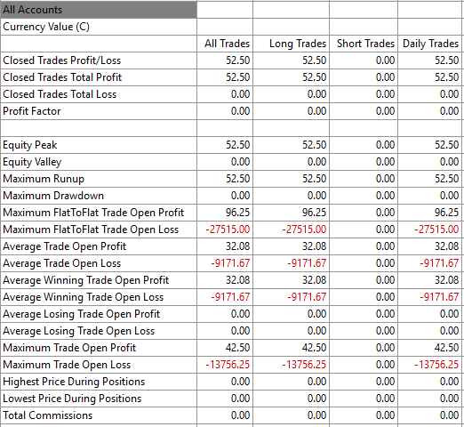 My chart is using ESM19_FUT_CME with MESM19_FUT_CME as the trade and current quote symbol. When calling sc.GetTradeStatisticsForSymbol, the profit and loss numbers seem to be using the CurrencyValuePerTick for the chart symbol vs sc.TradeAndCurrentQuoteSymbol. Is it my responsibility to perform the conversion? Executing sc.GetTradeStatisticsForSymbol produces the following s_ACSTradeStatistics ClosedProfit 517.41998884826899 double ClosedLoss -3.7899997085332870 double TotalCommission 11.369999125599861 double MaximumRunup 517.41998884826899 double MaximumDrawdown -3.7899997085332870 double MaximumTradeRunup 962.50922428444028 double MaximumTradeDrawdown -275149.99077571556 double MaximumOpenPositionProfit 425.00307476148009 double MaximumOpenPositionLoss -137562.49692523852 double TotalWinningTrades 2 int TotalLosingTrades 1 int TotalLongTrades 3 int TotalShortTrades 0 int TotalWinningQuantity 2.0000000000000000 double TotalLosingQuantity 1.0000000000000000 double TotalFilledQuantity 6.0000000000000000 double LargestTradeQuantity 1.0000000000000000 double LargestWinningTrade 271.20999414473772 double LargestLosingTrade -3.7899997085332870 double TimeInWinningTrades 328 int TimeInLosingTrades 1059 int MaxConsecutiveWinners 2 int MaxConsecutiveLosers 0 int Version 3 int LastTradeProfitLoss -3.7899997085332870 double LastTradeQuantity 1.0000000000000000 double + LastFillDateTime {m_dt=43619.407812800979 } SCDateTime + LastEntryDateTime {m_dt=43619.395556053321 } SCDateTime + LastExitDateTime {m_dt=43619.407812800979 } SCDateTime TotalBuyQuantity 6.0000000000000000 double TotalSellQuantity 0.00000000000000000 double The attached screenshot shows the Statistics Tab from the Trade Activity Log. |