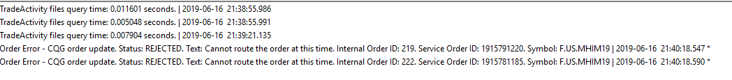 I am trading the mini Hang Seng. I get the message: TradeActivity files query time: 0.011601 seconds. | 2019-06-16 21:38:55.986 TradeActivity files query time: 0.005048 seconds. | 2019-06-16 21:38:55.991 TradeActivity files query time: 0.007904 seconds. | 2019-06-16 21:39:21.135 Order Error - CQG order update. Status: REJECTED. Text: Cannot route the order at this time. Internal Order ID: 219. Service Order ID: 1915791220. Symbol: F.US.MHIM19 | 2019-06-16 21:40:18.547 * Order Error - CQG order update. Status: REJECTED. Text: Cannot route the order at this time. Internal Order ID: 222. Service Order ID: 1915781185. Symbol: F.US.MHIM19 | 2019-06-16 21:40:18.590 * |