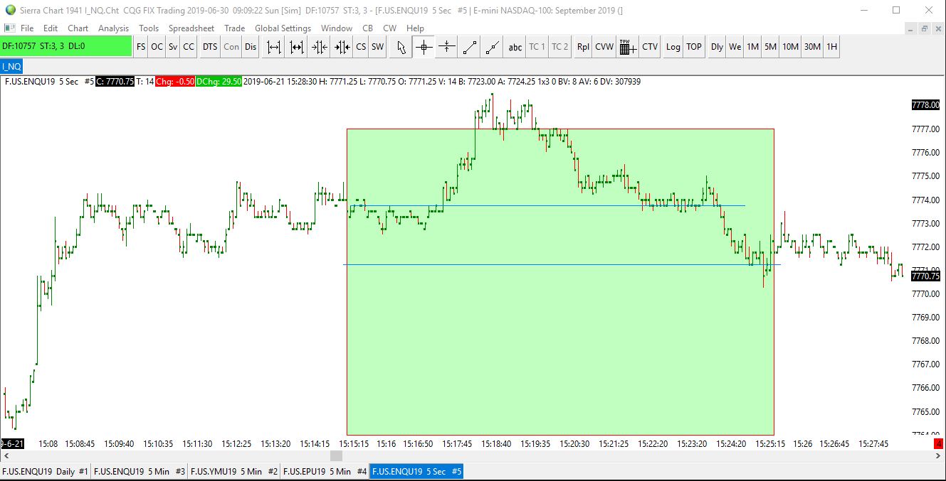 The software indicates it called for a market entry long at 7773.25, which the Trade Activity Log indicates was achieved. (No supporting attachment for entry due to the attachment limitation and the fact that there was no issue with the entry.) The software indicates it called for a stop loss to close the position at 7773.75. This stop loss was in place for the 15:20 candle which would have started at 15:15:01. Please see Jun21Exit.jpg attached. The trade activity log indicates an exit instead at 7771.25 at 15:24:58. I reached the limit for attachments, so at the bottom is a cut/paste of the Trade Activity Log for the trade in question. A 5-sec chart is also attached, with the candles from 15:15:05 until 15:25:20 (slightly after the actual exit) highlighted, and lines drawn at the expected exit price (7773.75) and actual exit price (7771.25). You can see that there were plenty of opportunities for the 7773.75 to have been executed, in fact almost from the moment the software moved the stop up to that level. I do not understand your comment about CFD data. I am connected through AMP CQG FIX. So the question is, why did I instead get a fill at fully 10 ticks below where the software had moved the stop? Trade Activity Log entry for trade in question: Symbol Trade Type Entry DateTime Exit DateTime Entry Price Exit Price Trade Quantity Profit/Loss (C) Cumulative Profit/Loss (C) Max Open Profit (C) Commission (C) High Price While Open Low Price While Open Max Open Quantity Max Closed Quantity FlatToFlat Profit/Loss (C) FlatToFlat Max Open Profit (C) FlatToFlat Max Open Loss (C) Max Open Loss (C) Entry Efficiency Exit Efficiency Total Efficiency Note Open Position Quantity Close Position Quantity [Sim]F.US.ENQU19 Long 2019-06-21 15:09:59.284 BP 2019-06-21 15:24:58.296 EP 7773.25 7771.25 1 -44.30 -328.60 105.00 4.30 7778.50 7771.25 1 1 -44.30 F 105.00 -40.00 -40.00 100.0% -3.0% -30.6% SimpleBracket.twconfig 1 0 Date Time Of Last Edit: 2019-06-30 13:24:16