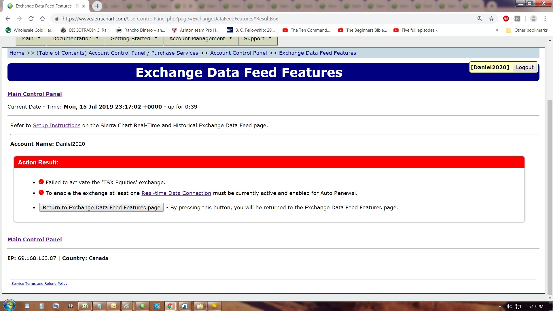Hi, I'm trying to setup the TSX data feed in Sierra charts. I have followed the instructions the best I can understand them and I am always sent back to this page. (see attached screen shot). I need help. Can you do a remote assistance ? Thanks, Daniel |
