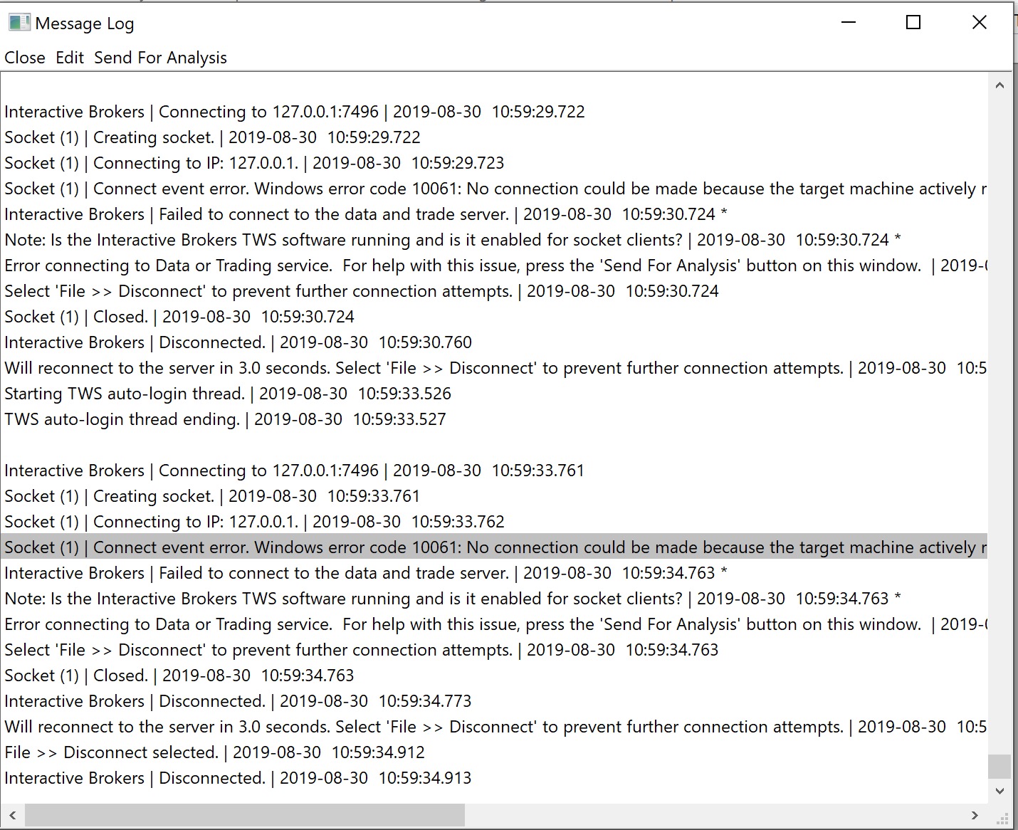 Hi, I just signed up for the demo of Sierra Charts. I am trying to connect my IB account to Sierra charts, but no luck. I have attached a screen shot of the error. Thanks |