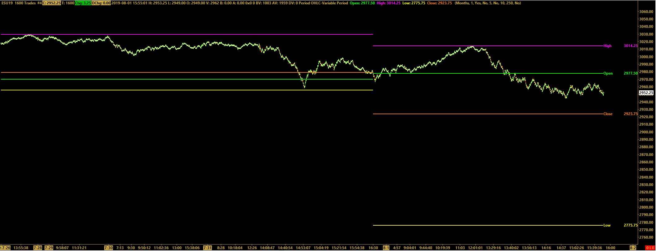 In my settings above for a 1600 tic chart. You can see (Capture2 attached) the values at the turn of the month of July/August when I scroll back. So it is working for multiple months. Also, the values for august are correct and also the ones for July are correct and match my daily charts. The high for July is 3029.50 for July for ESU19. you can see value in Cature3 below. You may want to check your chart settings (Capture4) to see if you are including overnight? your times don't have to be the same of course but make sure you are including 24 hour timeframe Date Time Of Last Edit: 2019-09-01 00:39:01