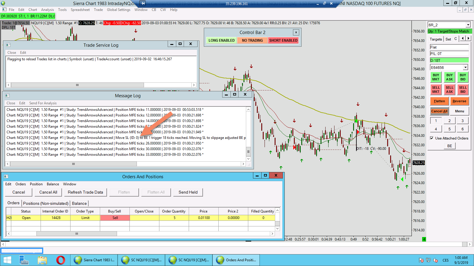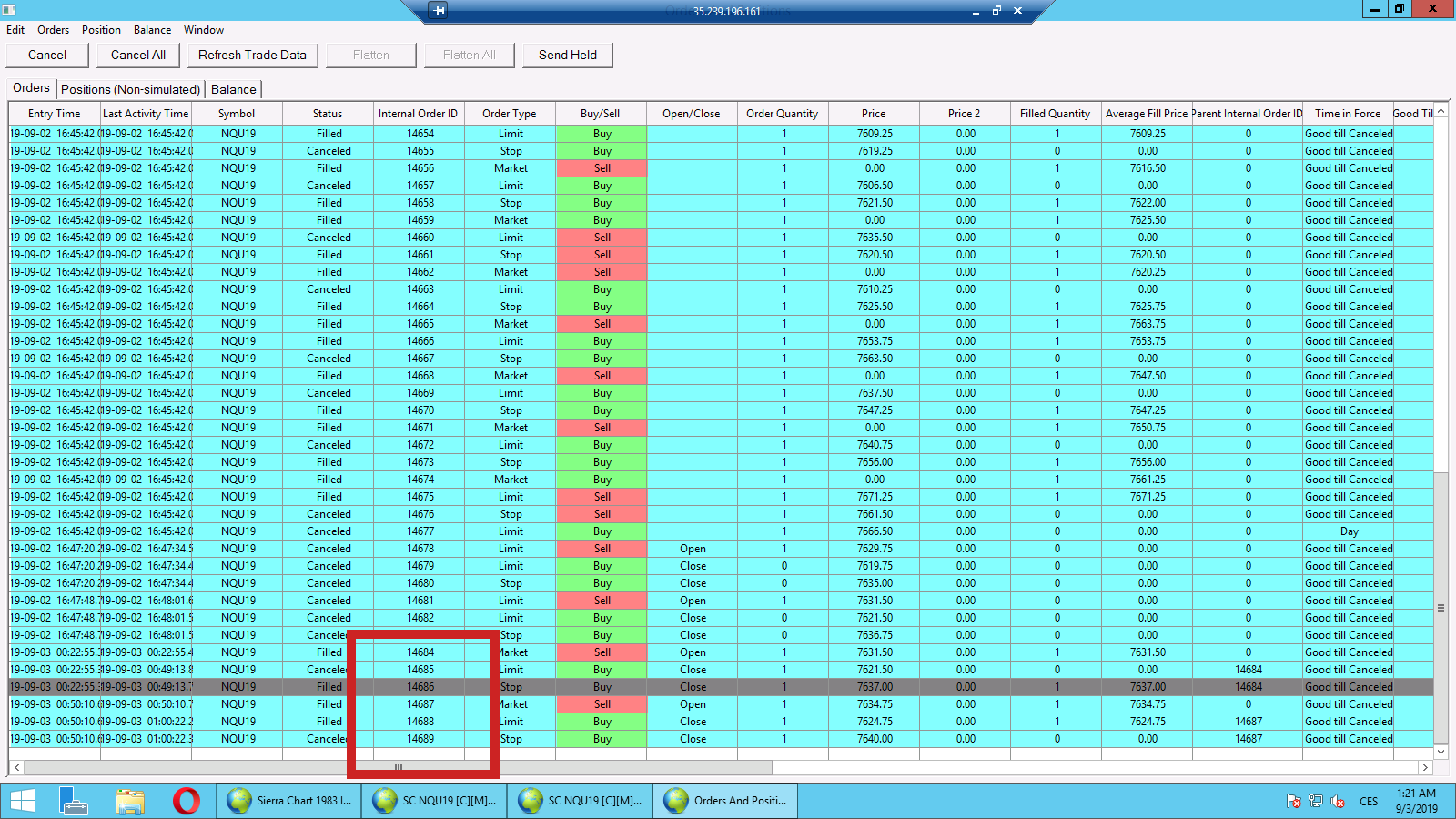 I am adjusting Stop1Order for a trade open with ACSIL. When using SIM / REPLAY mode everything works great. Once a trade is open Stop1InternalOrderID is set for example to value 14695 so ID is non-zero and order can be modified successfully But when I switch to live trading and open a trade with the same code Stop1InternalOrderID is always 0 so the order cannot be selected to modify With the very same code what could be the reason? Trade LIVE & REPLAY screenshot attached Also attaching executed orders table with IDs shown This opened the sell trade: s_SCNewOrder NewOrder; NewOrder.OrderQuantity = OCO1Size.GetInt() + OCO2Size.GetInt() + OCO3Size.GetInt(); NewOrder.OrderType = SCT_ORDERTYPE_MARKET; NewOrder.TimeInForce = SCT_TIF_GOOD_TILL_CANCELED; int Result = (int)sc.SellEntry(NewOrder); if (Result > 0) { EntryOrderID = NewOrder.InternalOrderID; Target1OrderID = NewOrder.Target1InternalOrderID; Stop1OrderID = NewOrder.Stop1InternalOrderID; } This is how I move to B/E // Get and move the existing SL 1 order s_SCTradeOrder ExistingStopOrder1; if (sc.GetOrderByOrderID(Stop1OrderID, ExistingStopOrder1) != SCTRADING_ORDER_ERROR) { if (IsWorkingOrderStatus(ExistingStopOrder1.OrderStatusCode)) { double NewStop = 0.0; if (ExistingStopOrder1.BuySell == BSE_SELL) { NewStop = PositionData.AveragePrice + (double)BE1OffsetTicks.GetInt() * sc.TickSize; } s_SCNewOrder ModifyStopOrder1; ModifyStopOrder1.InternalOrderID = Stop1OrderID; ModifyStopOrder1.Price1 = NewStop; if (sc.ModifyOrder(ModifyStopOrder1) != SCTRADING_ORDER_ERROR) { logMessage.Format("SL 1 order moved to BE"); if (LogMessages.GetYesNo() == 1) sc.AddMessageToLog(logMessage, 1); } else { logMessage.Format("Error modifying SL 1 order, ID: %u", Stop1OrderID); if (LogMessages.GetYesNo() == 1) sc.AddMessageToLog(logMessage, 1); } } moveBE1triggered = 1; } Thanks for your great support! Date Time Of Last Edit: 2019-09-03 06:27:42