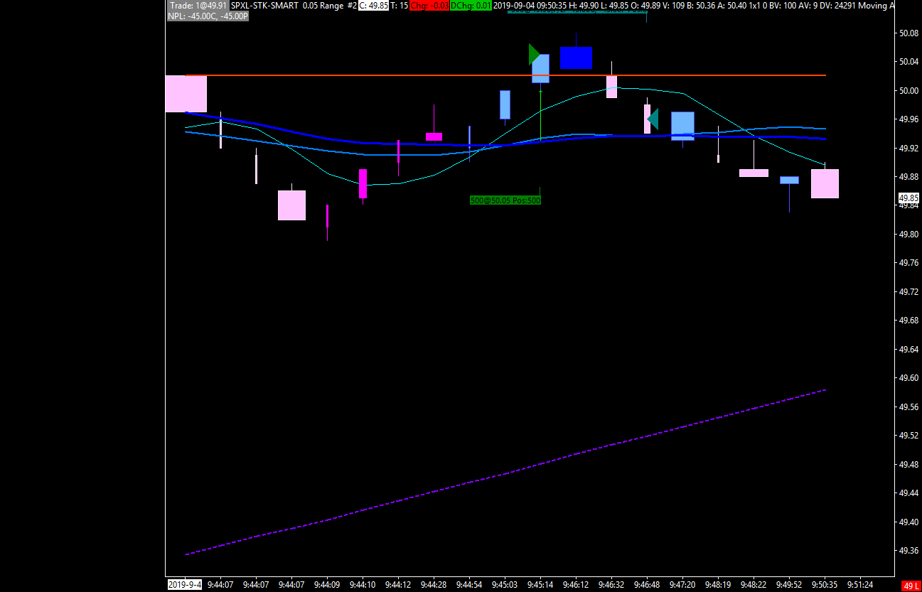 Stuck on a problem where the behavior does not appear to match the code. Using colorBar on alert with simple moving averages. If Fast>Medium>Slow color bar deep blue. Here is the code -> =AND(ID1.SG1>ID2.SG1,ID2.SG1>ID3.SG1). In the attachment the 3 MA's lined up but the colorBar did not paint, green arrow is pointing to it. I have the same code in the spreadsheet to trigger a trade and it executed when the MA's lined up. I have tried everything I could think of with no luck. Thanks