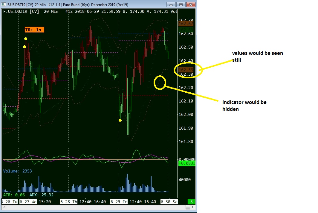 Hello, is it possible to hide Keltner channels for example (or any other indicator) but still see the value of its lines on the price axis? Thank you. Greg |