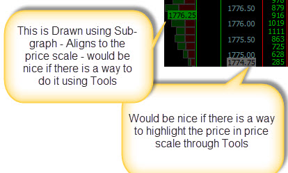 Hello SC Team - Have couple of questions related to TOOL_TEXT. Question 1 - I am trying to draw some text Left to a certain BarIndex using the option - DT_LEFT - but doesn't seem to work ( DT_RIGHT works or so it appears . Is this option available for TOOL_TEXT? With DT_LEFT - Would expect the last character of the text to be "left" of the bar index picked but it's not working as intended. Question 2 - Is there any option to Attach the text to the Price scale separator similar to the attached chart? At present I can do it using "sub-graph" and turning on the text. Would like to do it using TOOL_TEXT if it is an option. With Sub-graph based text - Irrespective of the horizontal scale - the text gets perfectly attached to the price scale and wanted to see if something similar can be done using TOOL_TEXT. Question 3 - Is it possible to highlight the price in Pricescale through Tools similar to the one you highlight using "last Price marker"? PS: Have explored the GDI route earlier but being handicapped due to "sc" structure not being available to GDI functions and trying to use TOOL_TEXT instead. Thanks Date Time Of Last Edit: 2013-12-17 15:54:49