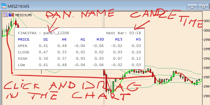 #define COLOR_BACK clrWhite #define COLOR_BORDER clrDimGray #define COLOR_CAPTION clrBlue #define COLOR_TEXT clrDimGray #define COLOR_WIN clrLimeGreen #define COLOR_LOSS clrOrangeRed CComment comment; //"comment" associated to the CComment class //--- init zone settings srand(GetTickCount()); //random number generation name="panel_"+IntegerToString(rand()); //panel name comment.Create(name,100,150); // panel creation: name, dimensionX, dimensionY (default initial position, not defined, automatically set in the left part of the chart) comment.SetAutoColors(InpAutoColors);//colors defined "Auto" comment.SetColor(COLOR_BORDER,COLOR_BACK,255);//border color assigned to clrDimGray comment.SetFont("Lucida Console",13,false,1.7);//font, dimension, etc comment.SetText(0,"FINESTRA : " + name, COLOR_TEXT);//first row (0) of the window, content, color comment.SetText(1,"PRICE D1 H4 H1 M30 M15 M5", COLOR_CAPTION);//second row (1) of the window, content, color ............ etc comment.Show();//finally show the window //--- main and recursive code for cicle (x>1)//x = row { comment.SetText(x, intest[x-2] + " " + DoubToStringa(D1p,2) + " " + DoubToStringa(H4p,2) + " " + DoubToStringa(H1p,2) + " " + DoubToStringa(M30p,2) + " " + DoubToStringa(M15p,2) + " " + DoubToStringa(M5p,2),COLOR_TEXT);//simply I go to calc all the rows I need and put them in the "comment" as string, if a row exist, simply replace it } comment.Show();//update the window content //on indicator exit comment.Destroy();//to remove the class object and delete the window |