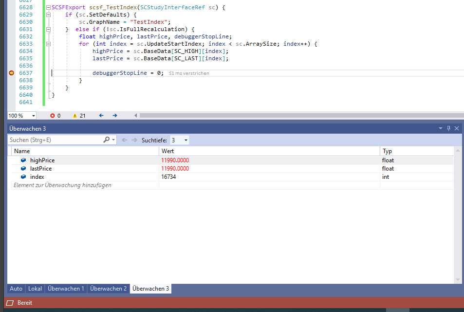 Believe me I'd be happy to be proven wrong - but another very simple test shows the following: I put together the following testing routine: SCSFExport scsf_TestIndex(SCStudyInterfaceRef sc) { if (sc.SetDefaults) { sc.GraphName = "TestIndex"; } else if (!sc.IsFullRecalculation) { float highPrice, lastPrice, debuggerStopLine; for (int index = sc.UpdateStartIndex; index < sc.ArraySize; index++) { highPrice = sc.BaseData[SC_HIGH][index]; lastPrice = sc.BaseData[SC_LAST][index]; debuggerStopLine = 0; } } } Please also note the index stays unchanged - so no new bar! Could the issue occur because of manual looping? I don't wanna bother you but this is a serious issue! Thank you for your help! Btw: I'm using version 2011 of Sierra Chart. |