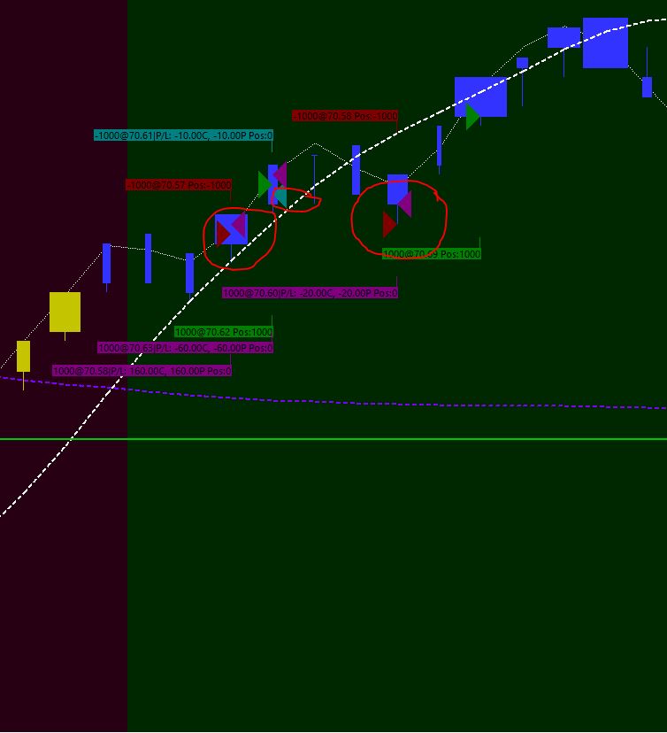 I am testing trading on a lower timeframe, referencing bars off a higher timeframe, 5 minute chart as the trend using Spreadsheets. The reddish background represents a trend on the 5 minute charts, means go Short. But the Spreadsheet trades Long while the 5 min trend is clearly short (see pic). I have tried setting all studies to Evaluate on Bar Close, Use Earliest Value for Corresponding Chart, etc. Stumped, why is the behavior different than the chart? Thanks |