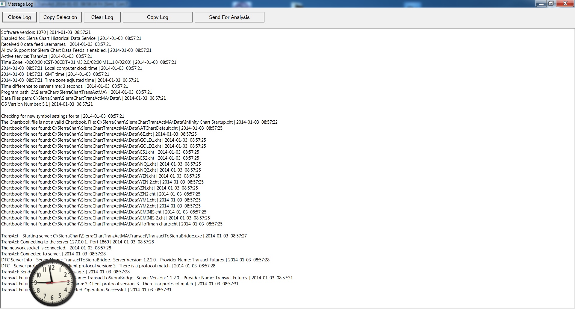 I have the global settings to where once the program opens, several chartbooks open automatically. It worked fine this morning, but after logging off and back on again, half of the chartbooks wouldn't open. I then upgraded the charts and the same thing happened. Now after logging off and back on for the 5th time so far, none of the charts will open up. I can open up and create a new one and some older chartbooks can open, but all of my current ones that I want to use will not. The error log is attached.