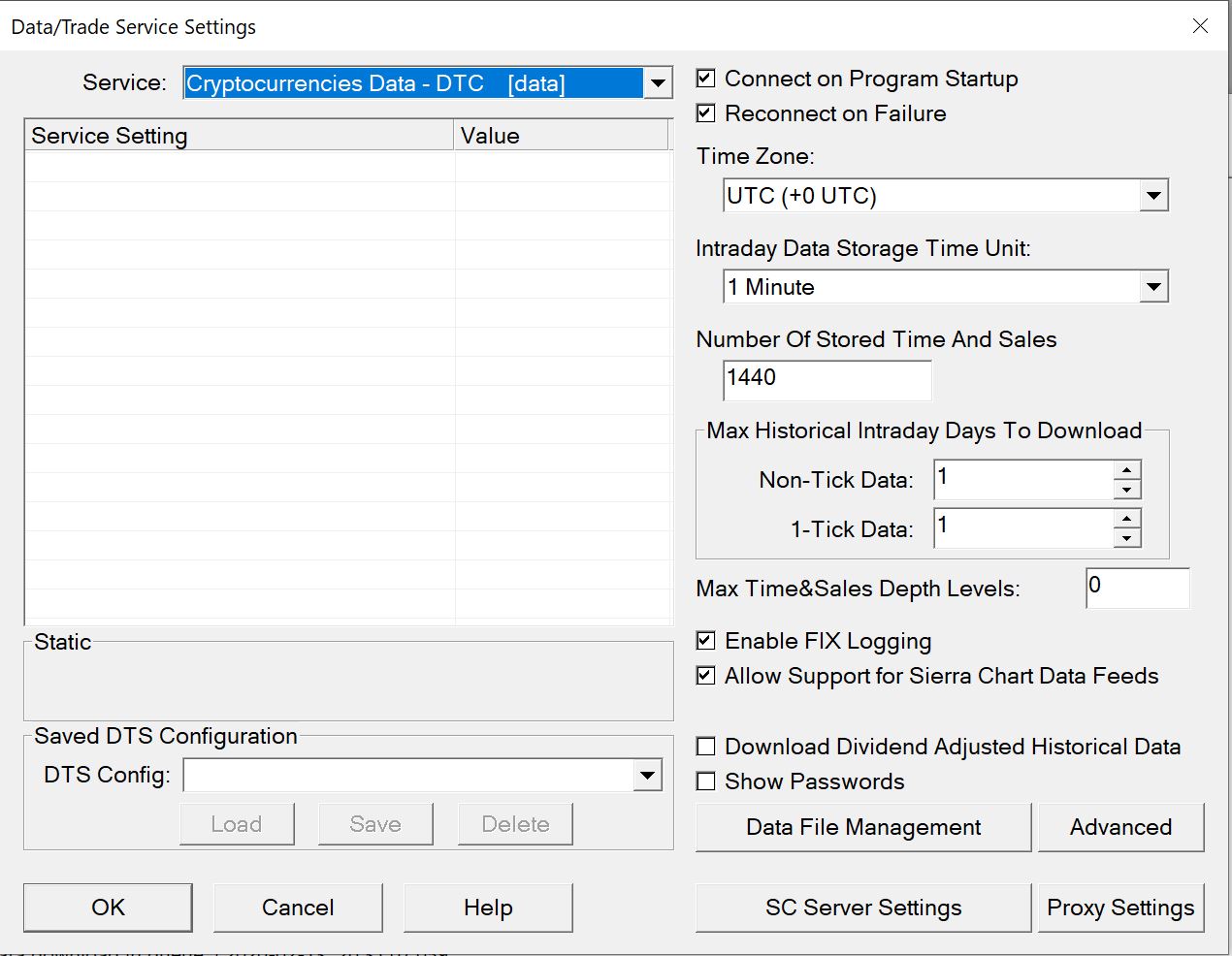 I am new to Sierra chart. I followed your instructions to try to connect to Bitmex and download data. I am simply looking to download 1 days worth of intraday data 1-minute bars. I made the following settings (see attached pic) and then hit ok. When I then go to "file >>> connect to data service", it is greyed-out. So I really don't understand what's going on, and why I cannot connect to the data service. Please help. |