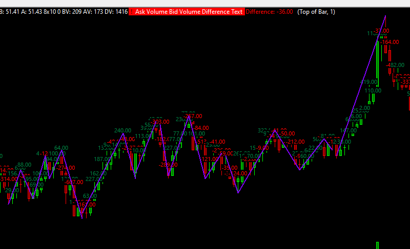 On this Study (Ask Vol/Bid Vol Diff. Text) is there anyway to have it calculate Swings for Delta instead of each bar? In the pic its each bars Delta that's displayed in Red and Green. I drew a couple of Swing/Pivots(Purple Lines) I'll like it to display Swing Lo to Swing Hi Delta, then the following Swing Hi to Swing Lo Delta and etc.