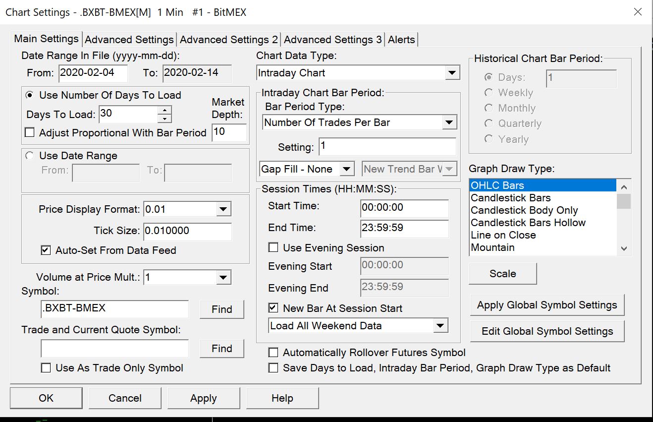 I cannot seem to get a simple intraday chart on the tick scale to open (Bitmex, XBT chart). I believe I have followed your instructions correctly: In the global settings >>> data/trade service settings, I have Intraday Data Storage time Unit set to 1 tick. In my chart settings, I have my chart settings as attached (see picture). I did initially download a 1 minute chart and that was fine. I understood that I had to delete all data and download which I did to no effect. I still only get a 1 minute chart no matter what I seem to do. Please help. |