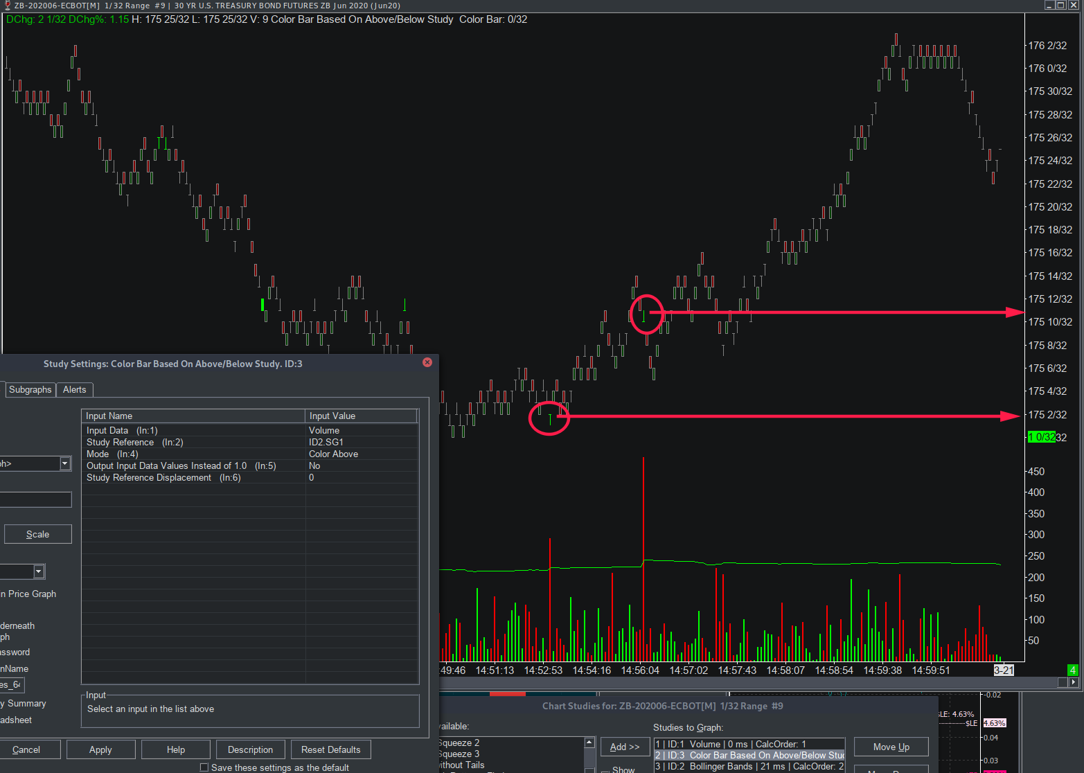 SC, i am trying to color all prices in the value scale for certain events. right now this is a chart to figure things out but eventually i want to color the prices in a DOM price scale. see screenshot attached, i have tried it with the "Color Bar Based On Above/Below Study" but i do not get this to plot ALL events, only the last one. are you aware of a method to get prices of all events when the volume ends up above that line plotted on the price scale? thank you. |