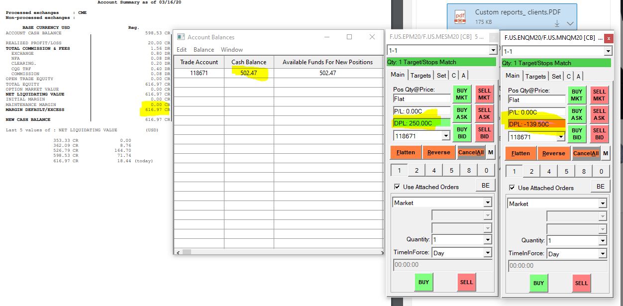 See attached. Entering today with zero trades my balance was $616.97 I then traded today as the DPL windows indicate. I traded nothing else than what I have shown in the attachment, i.e., just the /es and /nq micros. The DPL windows are indicating a small profit. However, the discrepancy is my Account Balance Window is showing a $114.95 loss. Are my DPL windows accurate? If not, how do I make them accurate? I've never had a problem with the DPL windows prior to this. This is a very large discrepancy. Thank you, |