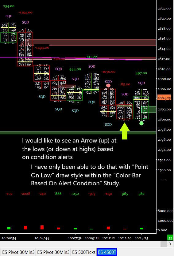 Hello, I am trying to get an up arrow at the lows (or down arrow at the high) of a bar based on a simple conditions. For example, If Close is lower than Open AND Numbers Bars Calculated value ("Ask Volume Bid Volume Difference Changes (SG3)) is > 0... then give me an Up arrow at the lows of the bar. =AND(C<O,ID4.SG3>0) See "What-I-Want-To-See" image. I have reviewed your documentation or read some threads on the support board but am still missing something. I have only been able to do that with "Point On Low" draw style within the "Color Bar Based On Alert Condition" Study but if I select an arrow (or triangle or anything else), I get an obscure graph. I have also played around with the scale setting but to no avail. See "What-I-Get" image. Thanks for your help. |