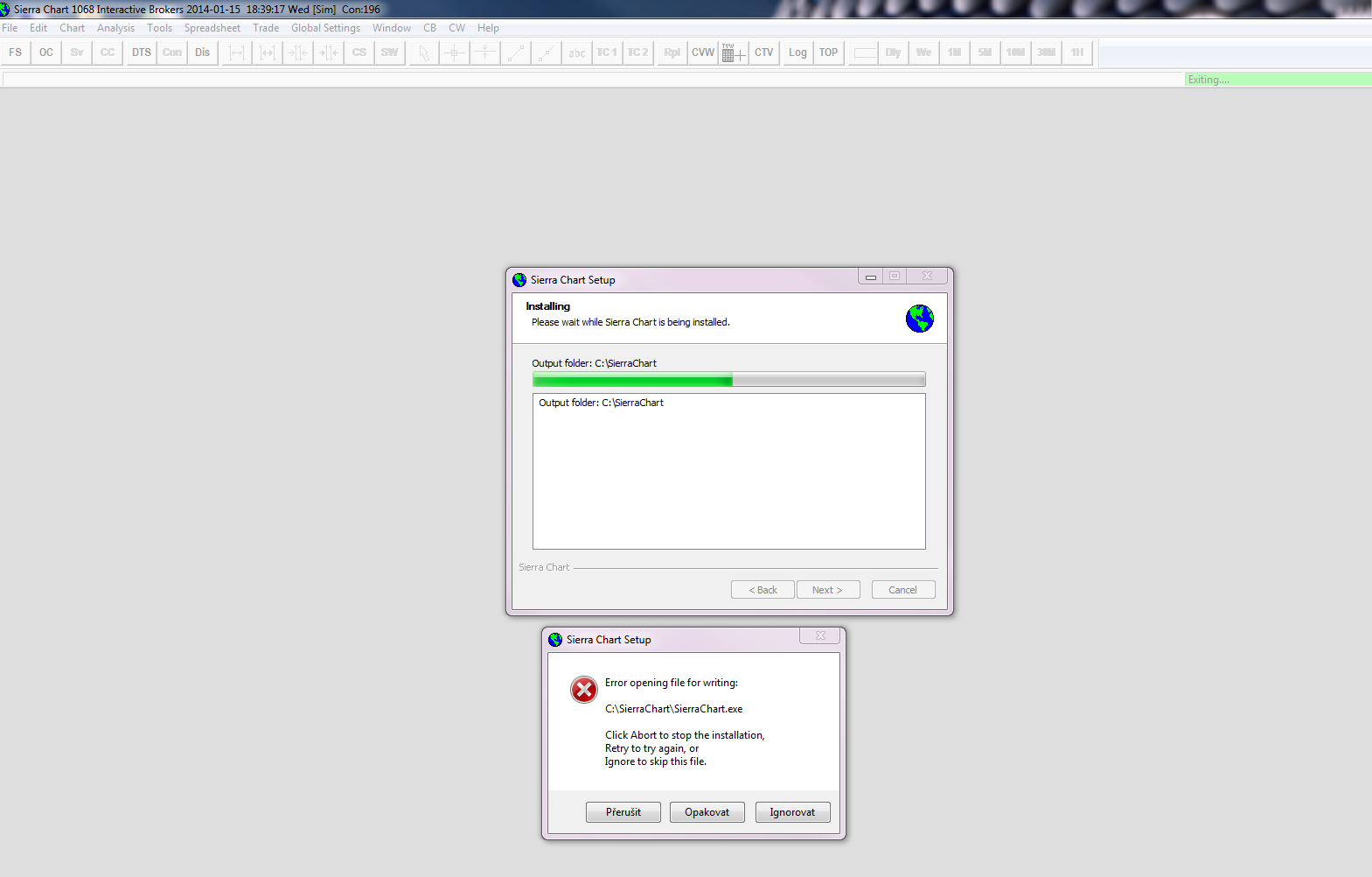Hello, I have got problem with rolling over to a new futures contract month. There are several possibilities how to rollover but I am not native English speaker and it is quite difficult to find the right way. I would like to ask you to give me exact guideline how to rollover. Here is my demand: I have got chart of future contract for example ES_2013_12 (e-mini S&P) with history starting from, let’s say, 9.30.2012 and I want to rollover to the new contract month ES_2014_03 and the history has to remain from 9.30.2012 as backadjusted. I would like to get simple quideline that I can use from now forever when rollingover. This time I have tried to rollover according to your help on your website. And I have got problem with downloading datas to my chart. For example I was last loged in Sierra on Friday 1.10. and when I have loged in today I can see in my chart datas only till 1.10.2014 and 1.15.14 from the time I have loged in. There are no datas for days 1.13. and 1.14. between. Second problem I have got with upgrading my actual Sierra version 1068 to the new one 1077. It can not write to the .exe file. I do not understand it as I have already upgraded several times and always without problem. I havn’t changed my PC adjustment since last upgrade. Regards AJ Date Time Of Last Edit: 2014-01-15 23:07:06