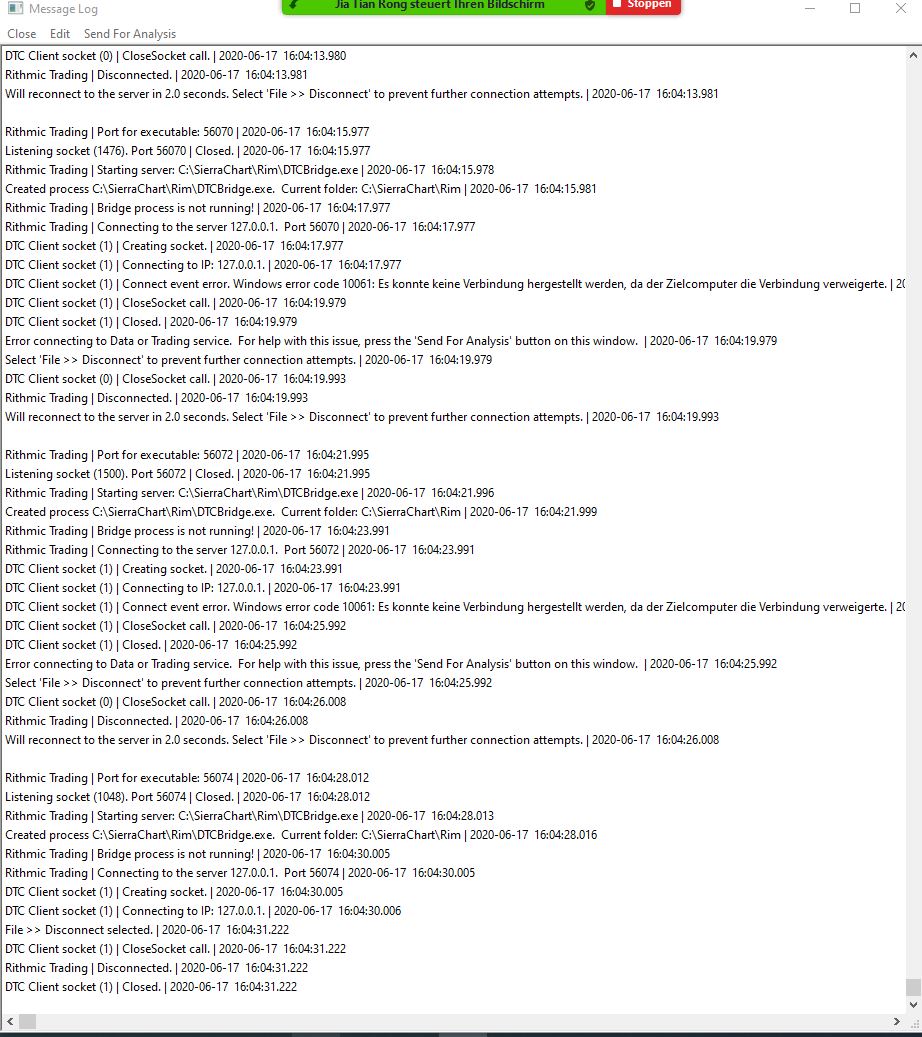 Hello, i have a new datafeed rithmic via AMP futures and it wont connect. I wasnt able to connect before and was able to sign-in via R-Trader and agreed the terms. A supporter of AMP futures was on my PC checking and said that usually it should help for teir customers and due this method didnt work on me i should contact you. I attached a screenshot of the log-file. (See attachments) Kind Regards |
