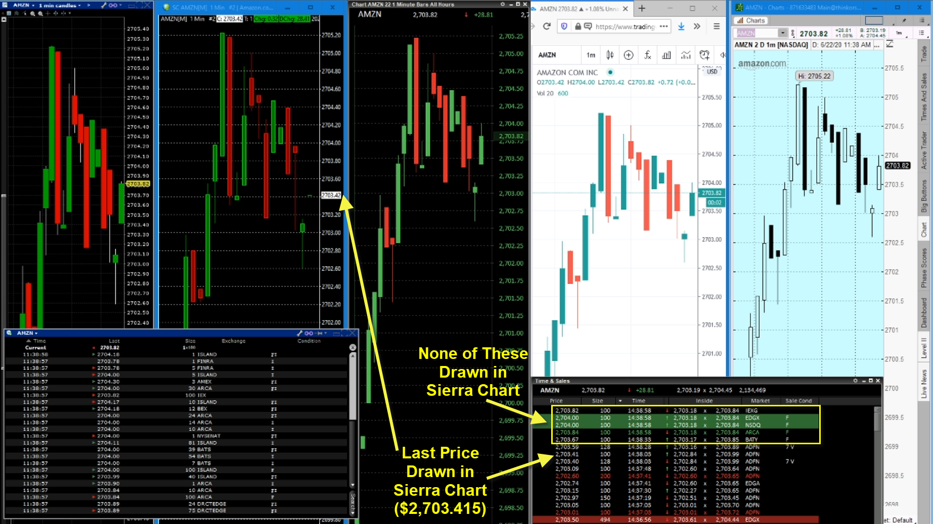 Here are a couple of screenshots showing 100 lot orders not drawn in Sierra Chart, but drawn in Interactive Brokers, Lightspeed, TradingView, and ThinkOrSwim. I'm not going to dig into this any further. This supposedly is your preferred data feed that you provide and that you claim is the only data feed that you officially support. It's obviously inadequate and I shouldn't have to waste my time testing your data and defending my claims. |
