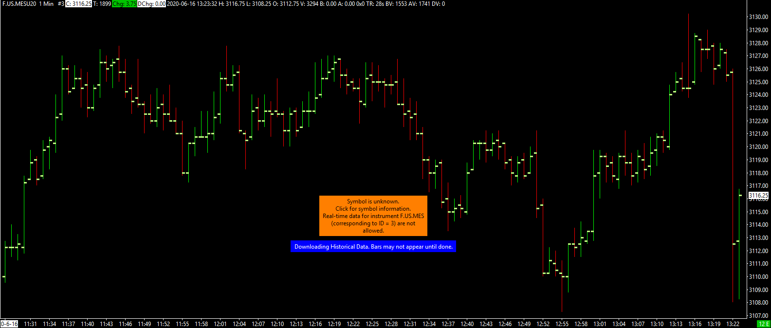 Here we go: Software version: 2124 64-bit | 2020-06-22 15:24:32.299 Primary Thread ID: 3756 | 2020-06-22 15:24:32.299 Usage end date: 2020-07-22 | 2020-06-22 15:24:32.299 Enabled for: Advanced Features 2. | 2020-06-22 15:24:32.299 Enabled for: Sierra Chart Historical Data Service. | 2020-06-22 15:24:32.299 Enabled for: Delayed Denali Real-Time Exchange Data Feed. | 2020-06-22 15:24:32.299 Allow Support for Sierra Chart Data Feeds is enabled. | 2020-06-22 15:24:32.299 Current selected Data/Trading service: CQG WebAPI | 2020-06-22 15:24:32.299 Custom symbol settings values: enabled | 2020-06-22 15:24:32.299 Chart Update Interval: 500 | 2020-06-22 15:24:32.300 Intraday Data Storage Time Unit: 0 | 2020-06-22 15:24:32.300 Time Zone: -05:00:00 (CST-06CDT+01,M3.2.0/02:00,M11.1.0/02:00) | 2020-06-22 15:24:32.300 2020-06-22 22:24:32 Local computer time | 2020-06-22 15:24:32.300 2020-06-22 20:24:32 Local computer time in UTC | 2020-06-22 15:24:32.300 2020-06-22 15:24:32 Local computer time in SC Time Zone | 2020-06-22 15:24:32.300 2020-06-22 20:21:23 Server time in UTC | 2020-06-22 15:24:32.300 Local computer UTC time and Server UTC time difference: 1 seconds. | 2020-06-22 15:24:32.300 Program path: C:\SierraChart\ | 2020-06-22 15:24:32.300 Data Files path: C:\SierraChart\Data\ | 2020-06-22 15:24:32.300 OS Version Number: 6.3 | 2020-06-22 15:24:32.300 Locale Setting: C | 2020-06-22 15:24:32.300 Allowed protected custom studies: | 2020-06-22 15:24:32.300 F.US.ENQU20 1 Min #2 | Reloading chart. | 2020-06-22 15:24:48.662 F.US.ENQU20 1 Min #2 | Currently no data in file to display. Will start historical data download and real-time updates. File: C:\SierraChart\Data\F.US.ENQU20.scid | 2020-06-22 15:24:48.682 CQG WebAPI | Starting real-time market data updates for: F.US.ENQU20. ID: 2 Service code: cqg | 2020-06-22 15:24:49.148 CQG WebAPI | Sending symbol resolution request for F.US.ENQU20. ID: 822783 | 2020-06-22 15:24:49.148 CQG WebAPI | Requesting security definition data for: F.US.ENQU20. ID: 2 | 2020-06-22 15:24:49.148 Added historical Intraday data request for F.US.ENQU20 to the queue. | 2020-06-22 15:24:49.148 Intraday data recording state for symbol F.US.ENQU20 is set to download 'Pending'. | 2020-06-22 15:24:49.148 Triggering next historical data download in queue. | 2020-06-22 15:24:49.148 Delaying start of download for F.US.ENQU20 | 2020-06-22 15:24:49.148 CQG WebAPI | Received symbol resolution report for symbol F.US.ENQU20. Search Symbol: F.US.ENQU20. Request ID: 822783. Contract ID: 2. | 2020-06-22 15:24:49.189 CQG WebAPI | Requesting market data for F.US.ENQU20 | 2020-06-22 15:24:49.189 CQG WebAPI | Market data subscription for F.US.ENQU20 was unsuccessful. Text: Real-time data for instrument F.US.ENQ (corresponding to ID = 2) are not allowed. | 2020-06-22 15:24:49.280 Symbol Error - F.US.ENQU20 is unknown, unavailable, or improperly formatted. Real-time data for instrument F.US.ENQ (corresponding to ID = 2) are not allowed. | 2020-06-22 15:24:49.280 HD Request # 2 | Downloading Intraday chart data for F.US.ENQU20 to the file F.US.ENQU20.scid. Service: cqg | 2020-06-22 15:24:49.384 Compressing file: C:\SierraChart\Data\F.US.ENQU20.scid. This may take a while. | 2020-06-22 15:24:49.386 HD Request # 2 | Download start date-time: 2019-12-19 14:24:49.000 | 2020-06-22 15:24:49.386 HD Request # 2 | Using server: ds12.sierracharts.com port 10149 | 2020-06-22 15:24:49.386 Socket (2) | Creating socket. | 2020-06-22 15:24:49.441 Socket (2) | Connecting to IP: 204.15.197.14. | 2020-06-22 15:24:49.441 HD Request # 2 | Setting DTC encoding to Binary VLS | 2020-06-22 15:24:49.723 HD Request # 2 | Sending historical data logon request message. | 2020-06-22 15:24:49.723 HD Request # 2 | Requesting Intraday data. Start date-time: 2019-12-19 14:24:49. Record interval: 0. Symbol: F.US.ENQU20 | 2020-06-22 15:24:50.336 HD Request # 2 | Decompressing data. | 2020-06-22 15:24:50.473 HD Request # 2 | Receiving Intraday data for F.US.ENQU20 starting at 2019-12-26 15:01:45 | 2020-06-22 15:24:50.920 HD Request # 2 | Timestamp of first Intraday data file record written: 2019-12-26 15:01:45 | 2020-06-22 15:24:51.386 Socket (2) | CloseSocket call. | 2020-06-22 15:25:08.258 Socket (2) | Shutdown started. Waiting for graceful close. | 2020-06-22 15:25:08.258 Historical data download thread signaled to stop. | 2020-06-22 15:25:08.261 HD Request # 2 | Received 2686855 records from 2019-12-26 15:01:45.000 to 2020-06-22 15:15:00.010 (179.0 days) and wrote 2686855 records for F.US.ENQU20 | 2020-06-22 15:25:08.262 HD Request # 2 | Completion time: 19s | 2020-06-22 15:25:08.263 HD Request # 2 | Intraday data download complete for F.US.ENQU20. Unique request ID: 2 | 2020-06-22 15:25:08.263 Removing historical data download ID 2. | 2020-06-22 15:25:08.263 Real-time Intraday chart data file updates started for F.US.ENQU20 | 2020-06-22 15:25:08.263 Intraday chart data file opened for F.US.ENQU20 | 2020-06-22 15:25:08.263 HD Request # 2 | Enabling Intraday chart updating for symbol. | 2020-06-22 15:25:08.263 Triggering next historical data download in queue. | 2020-06-22 15:25:08.263 Socket (2) | Socket gracefully closed by remote side. | 2020-06-22 15:25:08.393 Socket (2) | Closed. | 2020-06-22 15:25:08.393 http://www.sierrachart.com/image.php?Image=1592857733195.png My issue is: 1. i will backtest my system but without delayed data! WITHIN real non-delyed data! 2. will used fully and without issues CQG! solutions? thx. bye Date Time Of Last Edit: 2020-06-22 20:31:06