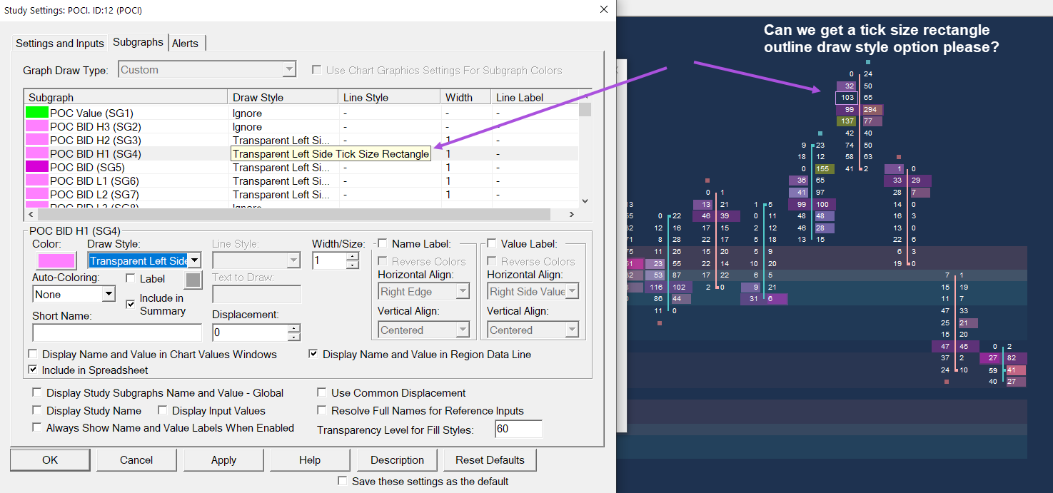 Hello Support Love the new transparent tick size rectangle draw styles. Was hoping we might be able to get tick size rectangle outlines next. My current work around is using color bar based on alert condition and then using the Bands/Envelope study with 0.5 ticks value and using either the Right Offset Box or Left Offset Box draw style. Means I end up with a lot of studies. It is messy. Be great to just have the option as a draw style. |