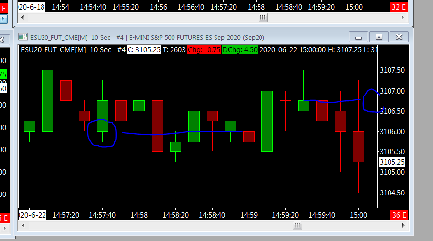 Hi Guys, I have tried my very best trying all the different studies that look at opn/close but I cannot find a study that would allow me to show the open of a time period and the close. I see I can do the high and low of a period, but I cannot find a way to show me the open and close. I know you have a previous close tool but that doesn't work for me. Here's my issue and REALLY appreciate you're reading this. I want to look at the what happens between the first 40 seconds of the last min of trading before 4pm close. ie what is open at 15.59.00 and what is the close at 15.59.40 So I just want to see what the bar is doing for that 40 seconds. I can't make a 40sec bar chart and it wont give me a bar that is specifically that exact time. I have made a nice 10 second bar chart with the high and low for that period, but what I need to see is open and close. In the quickness of charts moving it's hard to see where the open and close is. Does this make sense to you. I am attaching a chart. thank you thank you thank you thank Karen |