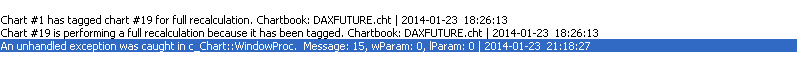 HI SC when i display "peaks and valley" for my DVP, a bug occur with the message "An unhandled exception was caught in c_chart::windowproc. message: 15, wparam: 0, Iparam:0 2014-01-23 21:18:27 " and the DVP disappear, the tape flashes... What is the problem ?? |