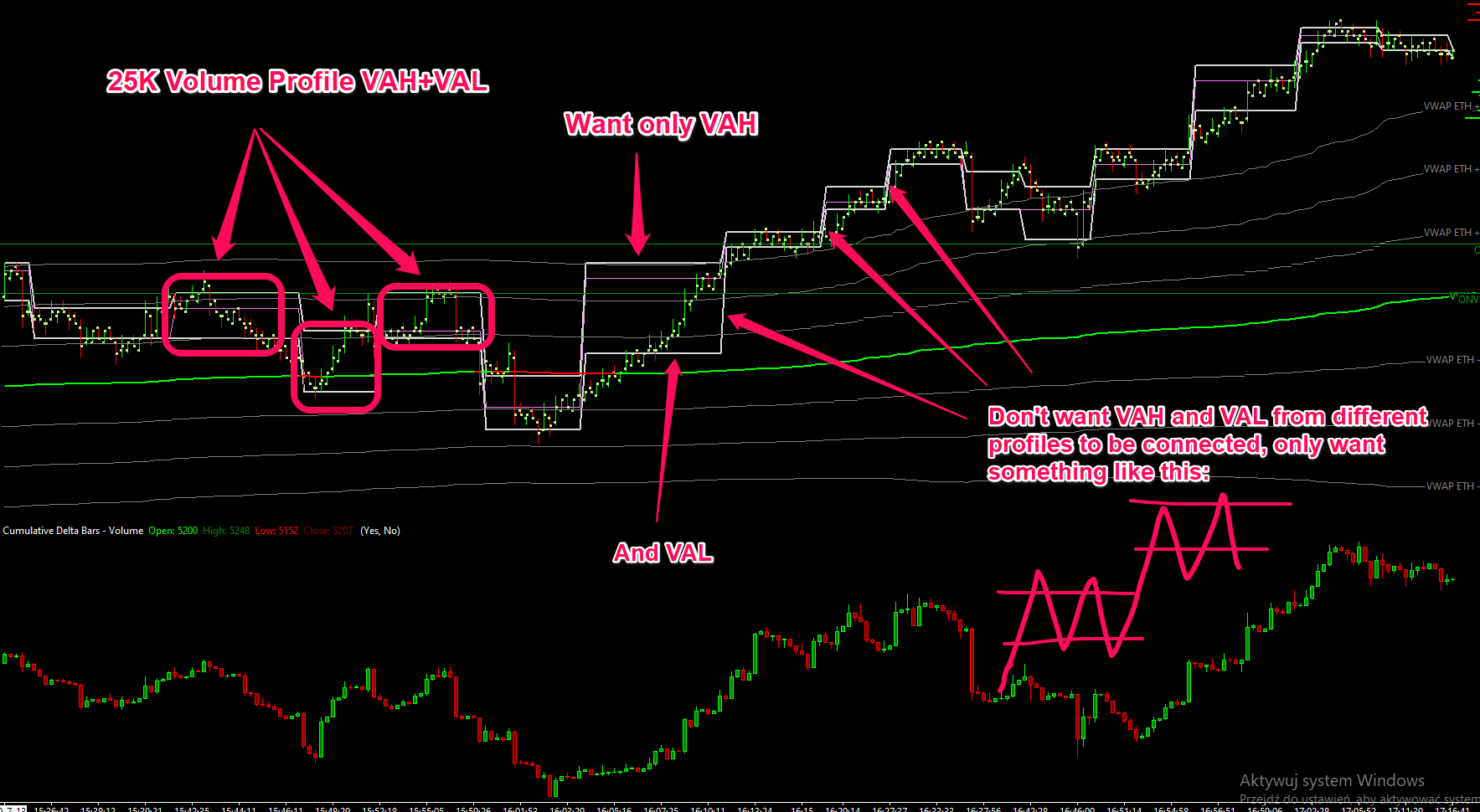 Hi Sorry to bother you, but I couldn't figure it out on my own Please take a look at attached screenshot I have multiple volume profiles set to draw each 25K of contracts. I display only VAH, VAL and VPOC from them I don't want the VAH/VAL/VPOC lines from separate profiles to be connected, it makes my chart a bit messy. How can I turn off this function and display this lines completely separately? |