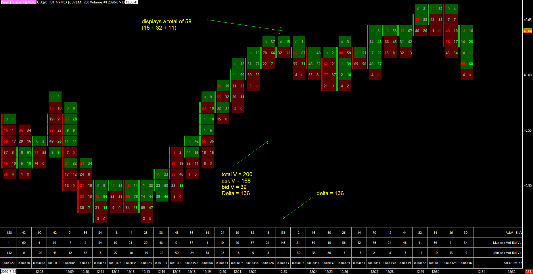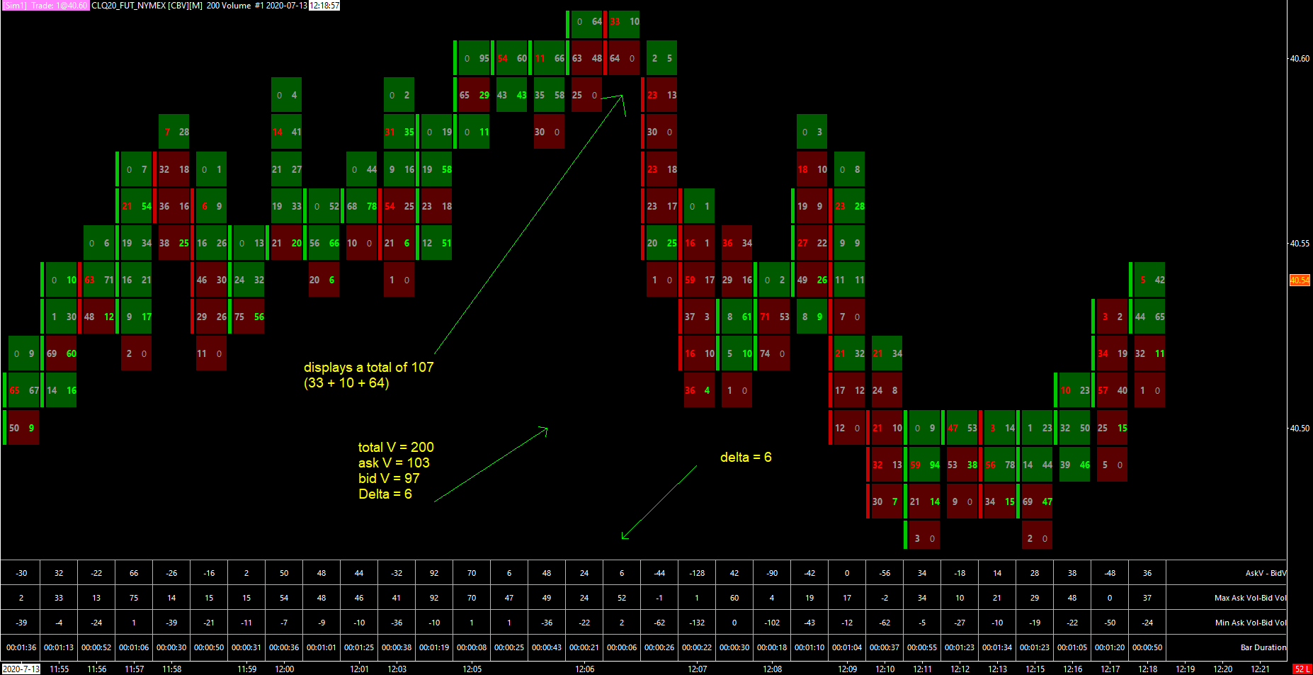 I use "Volume per Bar" as the bar period type, set at 200. Hence each number bar should display a bar with bid and ask volumes totaling 200. My data feed is Denali. Below is a screenshot where the total for the number bar equals 107, but the chart values shows a total volume = 200, with ask = 103 and bid V = 97 for delta = 6. The number bar is not consistent with the actual volume. This bar is from today at 12:06:40 EST http://www.sierrachart.com/image.php?Image=1594662108666.png Below is another screenshot where the total for the number bar equals 58, but the chart values shows a total volume = 200, with ask = 168 and bid V = 32 for delta = 136. This bar is from today at 12:23:09 EST http://www.sierrachart.com/image.php?Image=1594662676555.png Would appreciate any support to investigate and resolve this issue. Best regards |