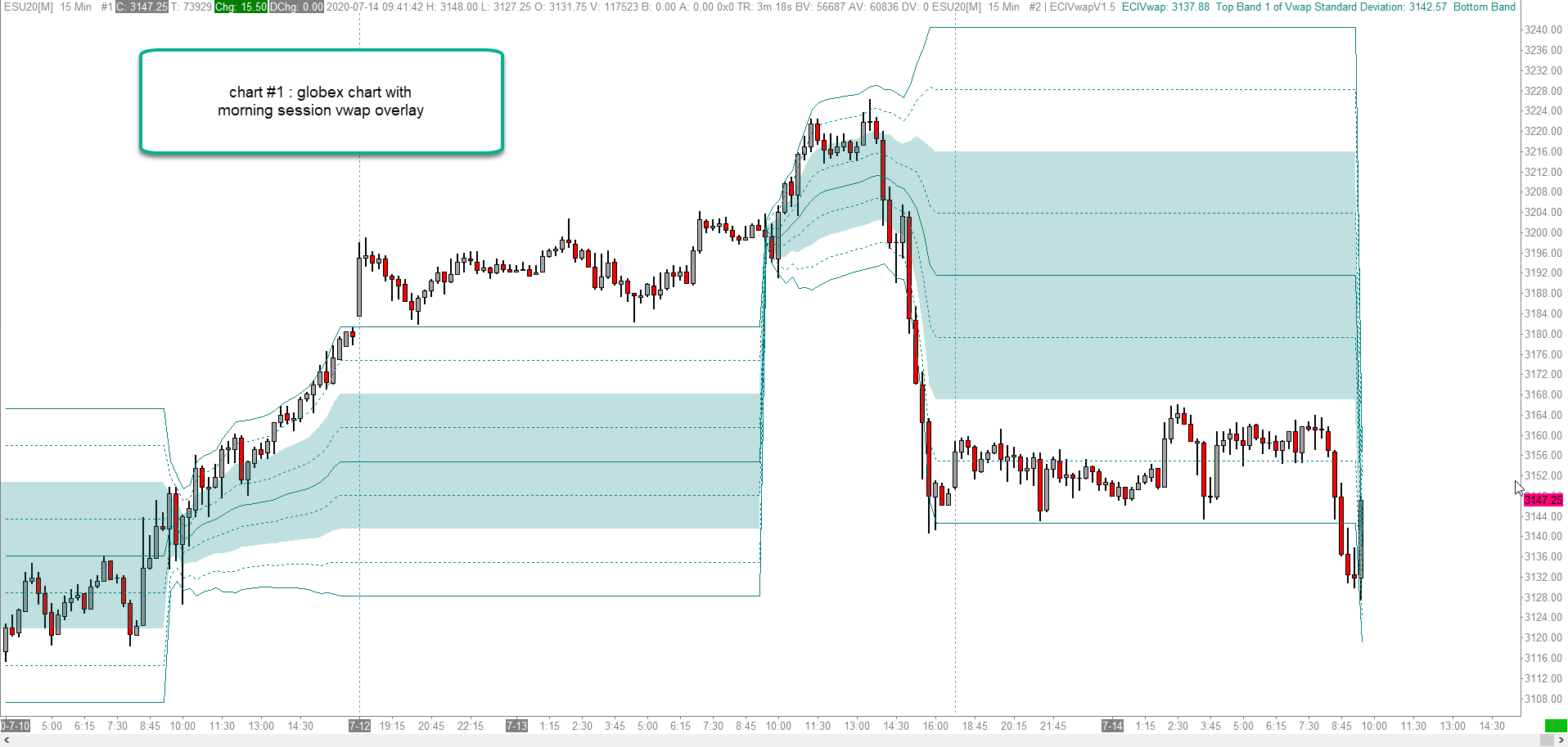 If I understand correctly, you want the regular vwap to appear on a globex session. If this is the case, you can try to do that we two charts. chart#1: globex or day session with day+evening session (for ex 18:00 - 17:00) chart#2: regular session (for ex 09:30 - 16:15) put a daily vwap on chart #2. overlay the chart#2 vwap on chart #1. be sure in the overlay to use: bar time containing match. I would also fill blanks with last value to yes. enclosed-by screenshots and chartbook. I used my ECIVwap, but you can do that with the native sierra vwap that works great and gives the same results for those vwaps. |