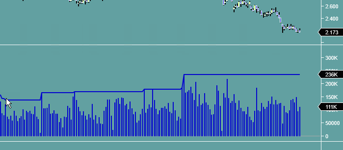 Hi I'm looking and trying for many hours how.. In a normal daily (historical) chart, I have a study "Volume". Now I'm looking for a study which shows me vor the last e.g. 90 Days a Maximum-Line on the level of the highes Volume Bar. If maybe today we have the highes volume of the last 90 days, then the line goes higher and hold this level as long as higher Volume day comes within the 90 days span. I have really no idea where I have to search for it. Have tried dozens of studies with span/range/ etc. Would be very happy for a hint. Thanks a lot and kind regards, Stephan |
