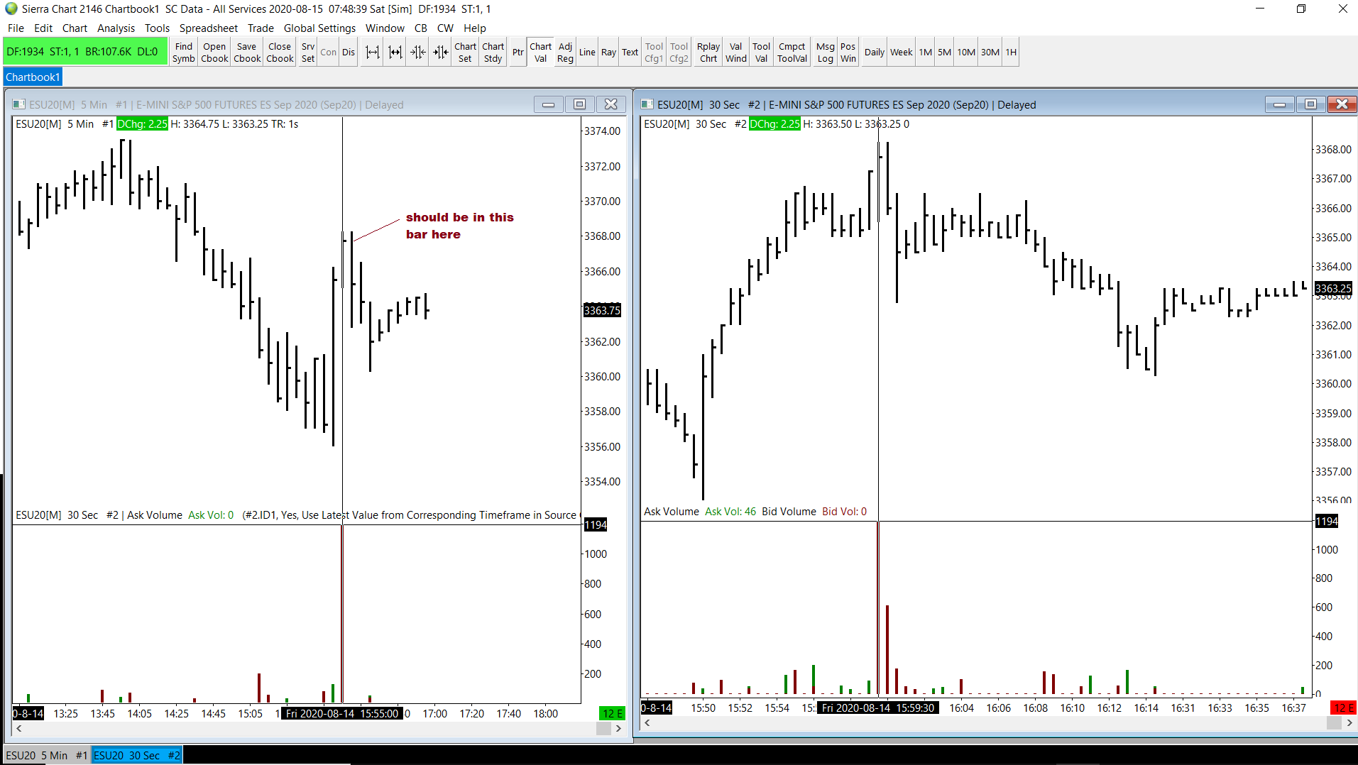 Hi there, I noticed a bug in this study. The volumes are either in the incorrect bar, or missing. I have two charts on the chartbook = 5min and 30sec. 30s is configured to filter volume equal or less then 29. Bid vol and ask vol loaded on the chart. In 5min I loaded study/price overlay study, chose the bid and ask vol studies from 30s chart, chose the option for bar match to "containing match" (but really, does not make any difference this option , already checked), but as you can see from the screenshots, there is a lot of missing volume in the 5min chart that happened inside that bar in 30s. I also attached to this post the chartbook file, so you can check for yourself. Regards Date Time Of Last Edit: 2020-08-15 12:16:32