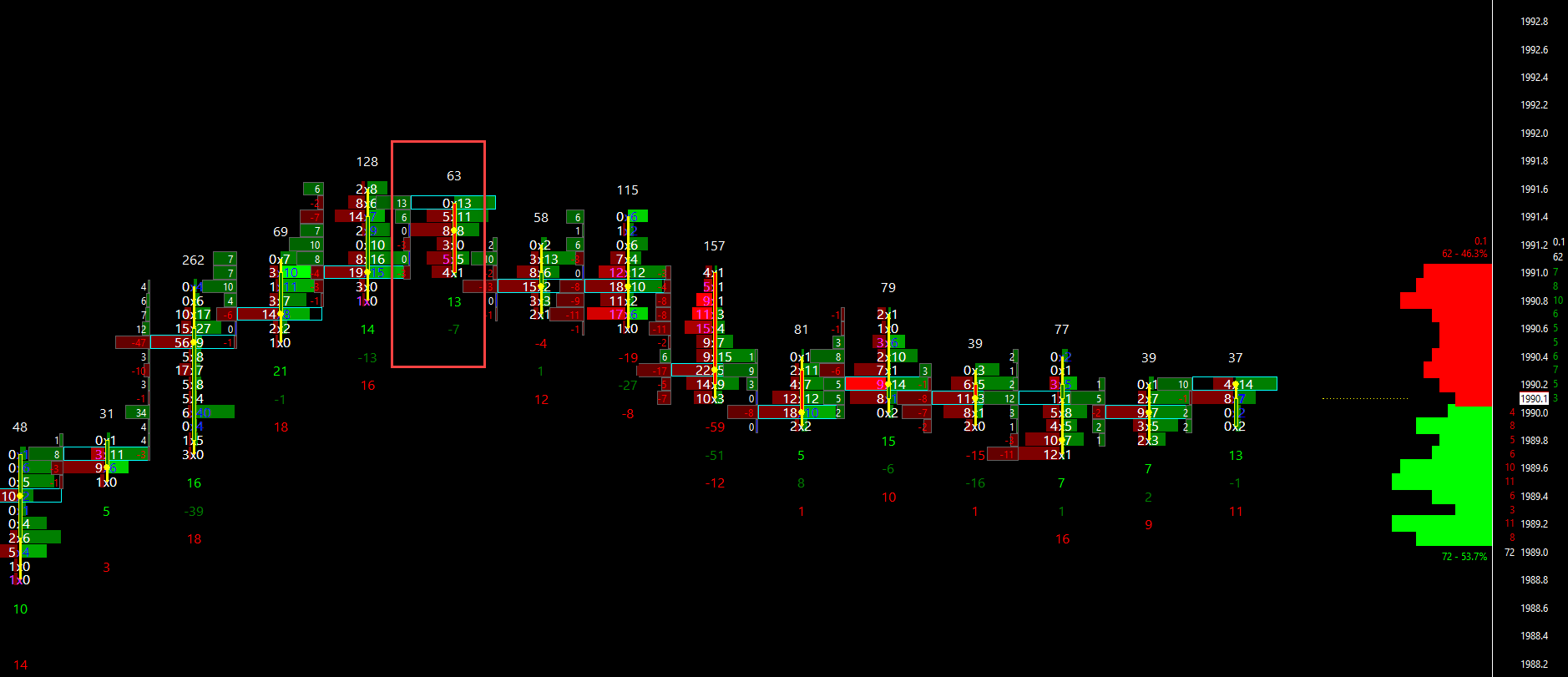 Hi i'm using volume by price study(1x) and numbers bars study (2xs). Is there a way to get the volume by price and numbers bar to have a little more separation from the last bar as seen in the snapshot. On another note, is there a way to separately show Volume Profile split bid ask and then allow to show Text Based on Dominant Diagonal Ask Vol Bid Vol percentage so that the colors don't disappear into the profile. Thanks |