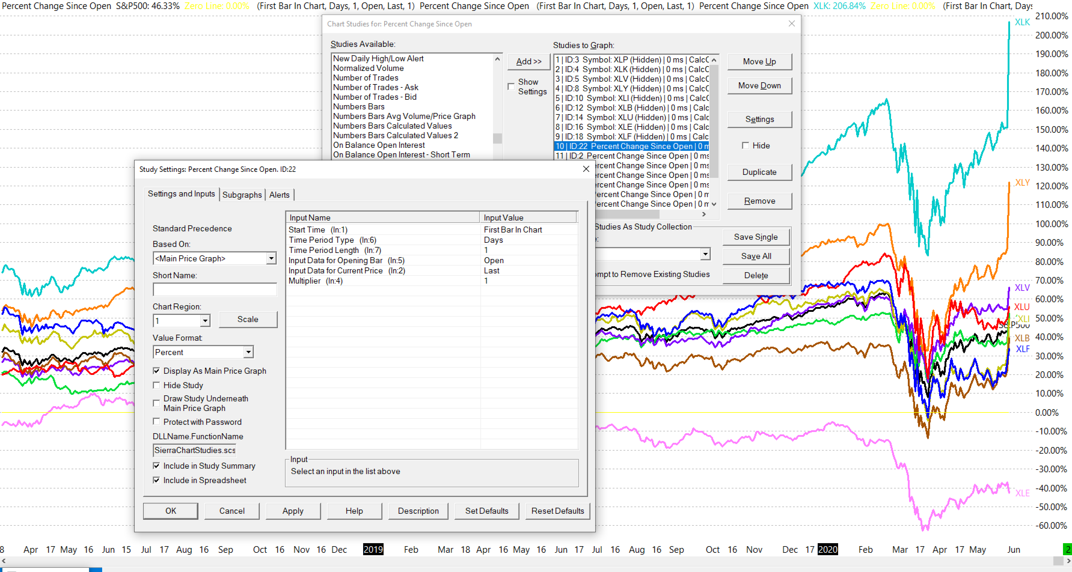 Hi, I built a percentage-based comparison of S&P sectors. I used "Add Additional Symbol" and "Percent Change since Open" Studies as described in the documentation. It worked for some time without problem. But since a few weeks the graph shows an annoying bug. See screenshot. There is always an "up-hook" at the end of the chart. The DLY data files look ok. I just upgraded to version 2158. Kept the same. Regards, Jens |