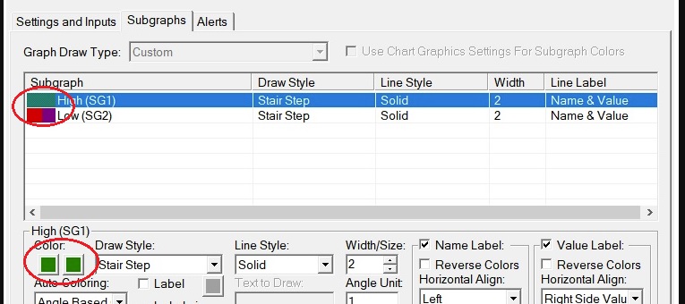 1. How can I have 2 tone visual aid on stair steps whenever there is a new high or low? 2. Just out of curiosity, when angle based gradient is selected, what is the purpose of the 2 color tabs circled on jpeg if they do not represent the colors of stair steps on chart? |