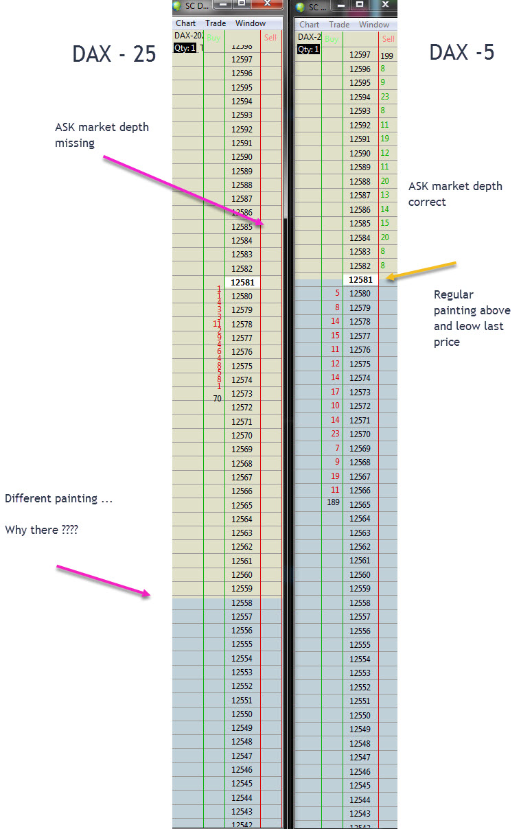 Hello, Some trouble with EUREX DAX 25 contract DOM : - no ask depth - incorrect painting of price above/below last price. Noticed it a couple of days ago. Everything is fine for : DAX - 5 FGBL EUROSTOXX 50 Thanks in advance, Regards JM |
