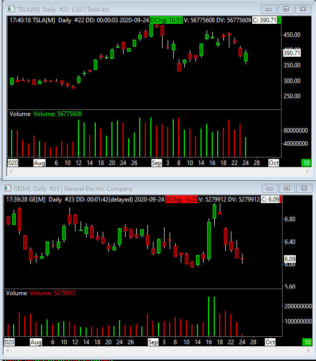 Hello, For reasons mentioned already on the support forum, I am used to seeing daily volume +/-10% from what Nasdaq and other sites report... but I am seeing something really abnormal right now. After market close @ about 5:40 EST I am seeing SC show the daily volumes for TSLA and GE to be about 57 million and 5 million respectively (please see attachment). The correct volumes should be 96 millions and 95 million. 1 observation I can make is that when the charts were first loading up, I did see the TSLA chart momentarily show a daily volume of around 95 million but the number then flipped to the 57 million when the chart "settled". With both TSLA and GE daily charts, I am noticing that using the option to "Delete and download Data" seems to momentarily display the correct daily volume number on their charts, but it then later reverts to display the erroneous volume numbers. Thank you. Date Time Of Last Edit: 2020-09-24 22:45:42