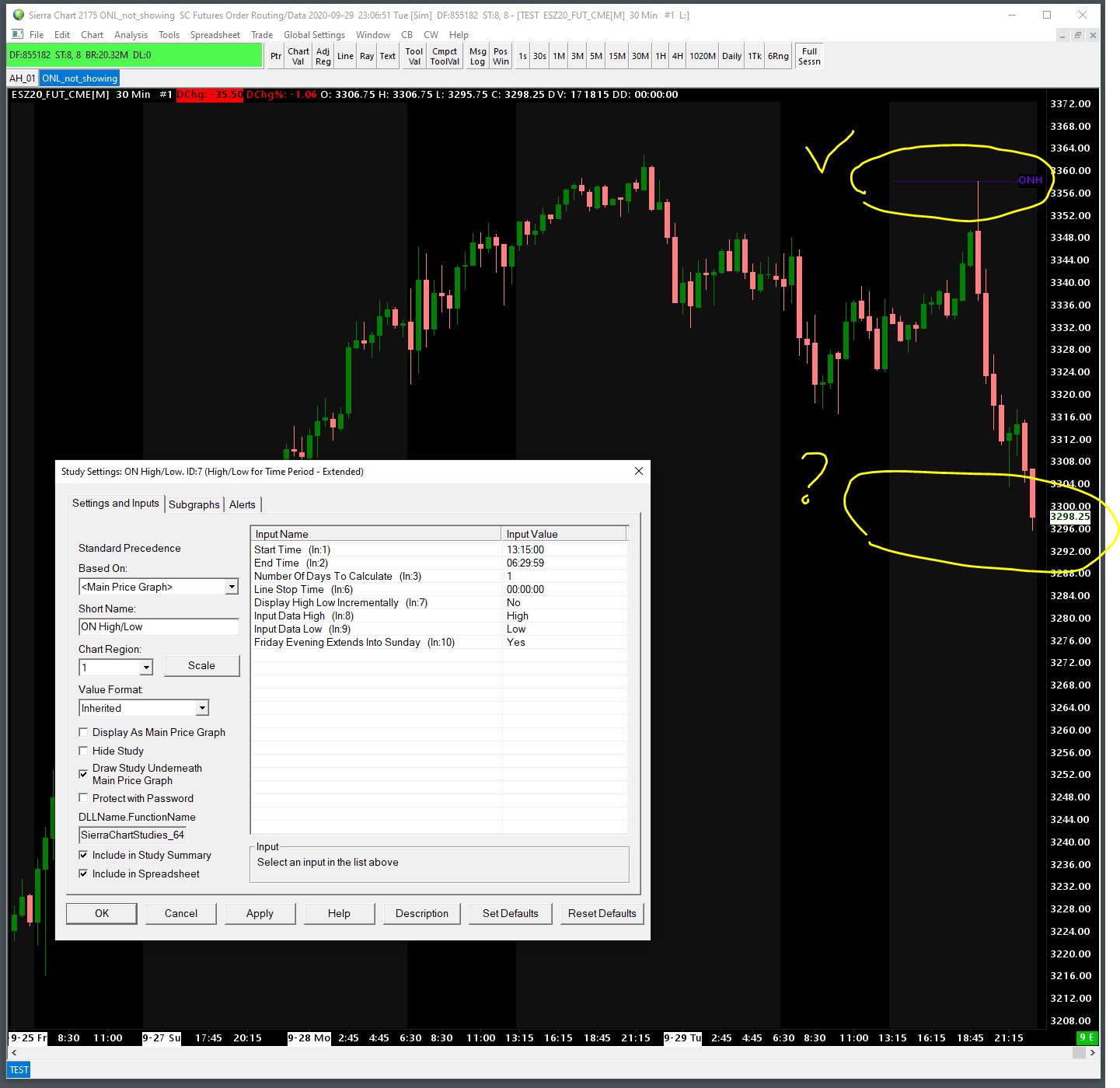 "High/Low for Time Period - Extended" not showing the Low. I have tried in multiple charts with different intraday periods and could not get the Low to work. At times, even the High would disappear and the study had to be removed and re-added to show again. The low has never worked. See chartbook and screenshots attached. |