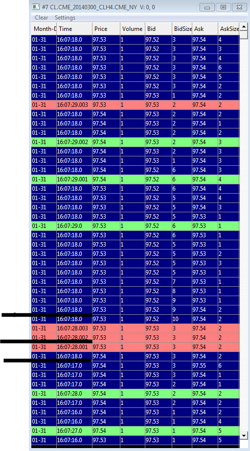 Dear SC Support I've noticed some critical issues using SC RTDF: CL (NYMEX) - there are asynchronous data in T&S: a time of a trade was inconsistent to BBO updates independently to market depth data was/not/ subscribed to . pls see the picture. 6E(CME) and GC(COMEX) - T&S looks good until market depth data was subscribed to (open a DOM window) after that there are asynchronous data in T&S: a time of a trade was inconsistent to BBO updates Also I suppose the update frequency for BBO is not so often as for other datafeeds (R/IQFeed). Some info will follow. Please check these issues. Thank you. |