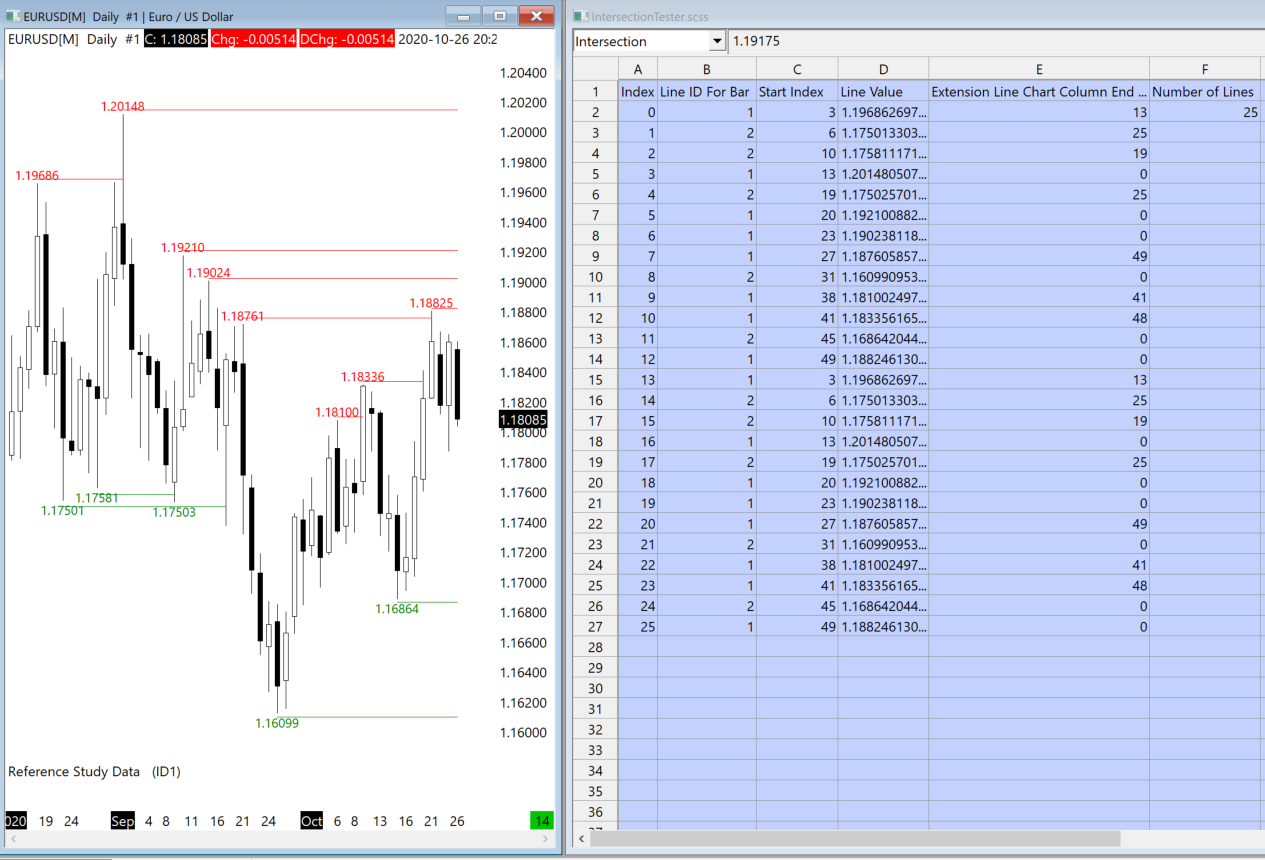 The code below gives the output as per the attached picture 'Line until Intersection.PNG' when it is recalculated it gives the output of 'Line until Intersection 2.PNG' It doesn't replace upon recalculation it adds to the variable. The Actual Number of Lines Until future Intersection is not increasing. #include "sierrachart.h" SCDLLName("Get Future Intersection Lines") SCSFExport scsf_IntersectionLines(SCStudyInterfaceRef sc) { if (sc.SetDefaults) { sc.GraphName = "Reference Study Data"; sc.StudyDescription = "Referencing data from other studies on the chart."; sc.AutoLoop = 0; // low precedence level to ensure other studies are calculated first. sc.CalculationPrecedence = LOW_PREC_LEVEL; sc.Input[1].Name = "Study Reference"; sc.Input[1].SetStudyID(1); return; } // choose spreadsheet to put data on const char* SheetCollectionName = "IntersectionTester"; const char* SheetName = "Intersection"; void* SheetHandle = sc.GetSpreadsheetSheetHandleByName(SheetCollectionName, SheetName, false); sc.SetSheetCellAsString(SheetHandle, 0, 0, "Index"); sc.SetSheetCellAsString(SheetHandle, 1, 0, "Line ID For Bar"); sc.SetSheetCellAsString(SheetHandle, 2, 0, "Start Index"); sc.SetSheetCellAsString(SheetHandle, 3, 0, "Line Value"); sc.SetSheetCellAsString(SheetHandle, 4, 0, "Extension Line Chart Column End Index"); sc.SetSheetCellAsString(SheetHandle, 5, 0, "Number of Lines"); int LineIDForBar = 0; int StartIndex = 0; float LineValue = 0; int ExtensionLineChartColumnEndIndex = 0; int Index = 0; Index = sc.GetNumLinesUntilFutureIntersection(sc.ChartNumber, sc.Input[1].GetStudyID()) - 1; sc.SetSheetCellAsDouble(SheetHandle, 5, 1, Index); for (Index; Index >= 0; Index--) { sc.GetStudyLineUntilFutureIntersectionByIndex(sc.ChartNumber, sc.Input[1].GetStudyID(), Index, LineIDForBar, StartIndex, LineValue, ExtensionLineChartColumnEndIndex); // Set labels in Row 1. {SheetHandle, Column, Row, Value} sc.SetSheetCellAsDouble(SheetHandle, 0, Index + 1, Index); sc.SetSheetCellAsDouble(SheetHandle, 1, Index + 1, LineIDForBar); sc.SetSheetCellAsDouble(SheetHandle, 2, Index + 1, StartIndex); sc.SetSheetCellAsDouble(SheetHandle, 3, Index + 1, LineValue); sc.SetSheetCellAsDouble(SheetHandle, 4, Index + 1, ExtensionLineChartColumnEndIndex); } } Date Time Of Last Edit: 2020-10-26 20:43:02